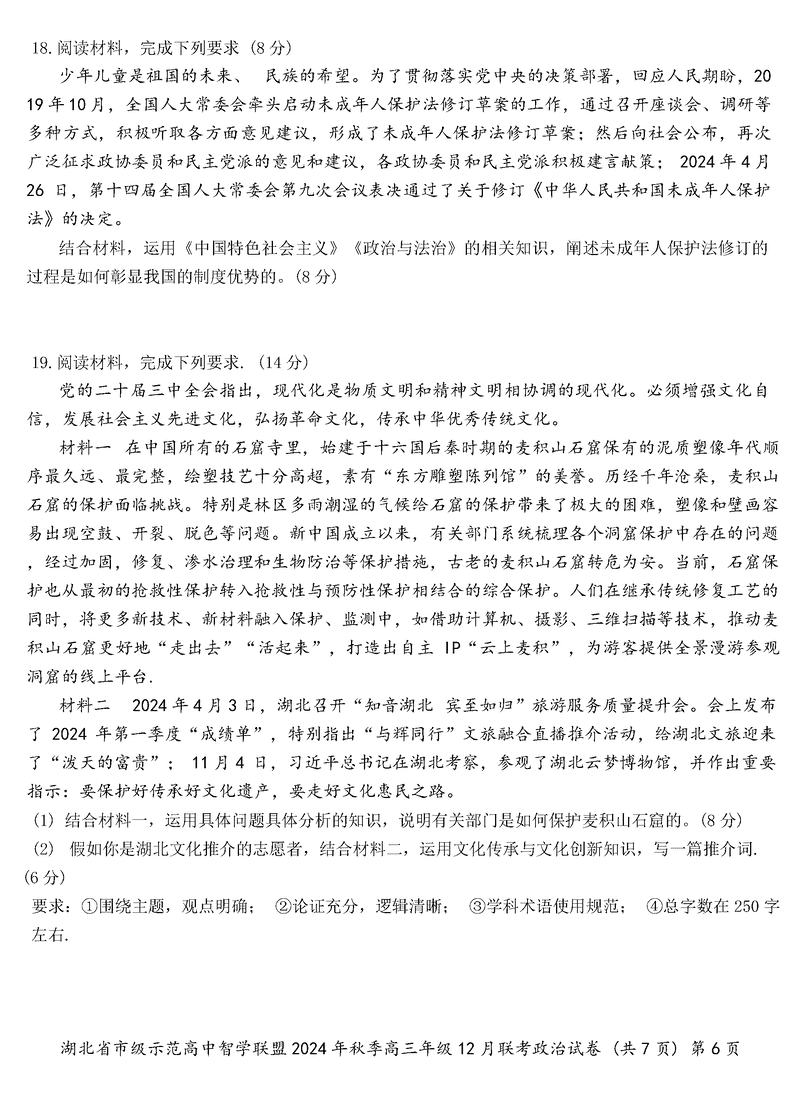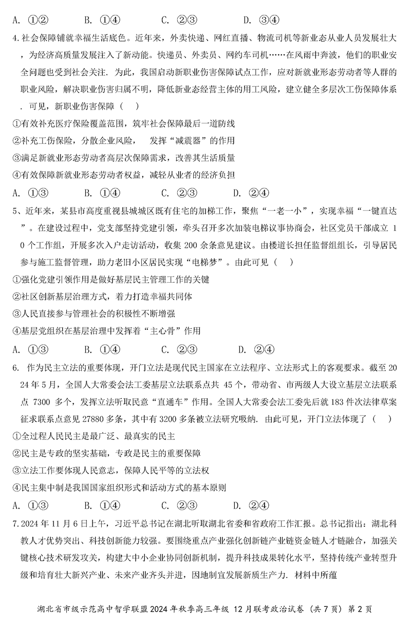 湖北智学联盟2024年秋季高三12月联考政治试题及答案