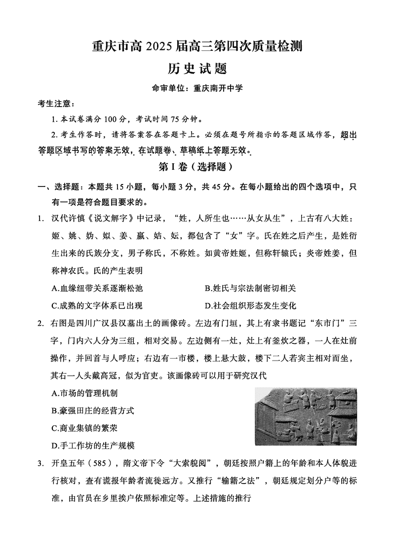 重庆南开中学2025届高三第四次质检历史试题及答案