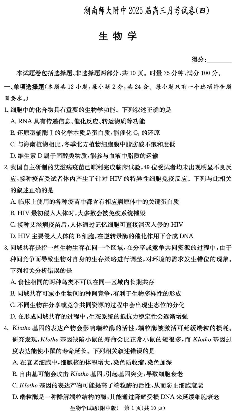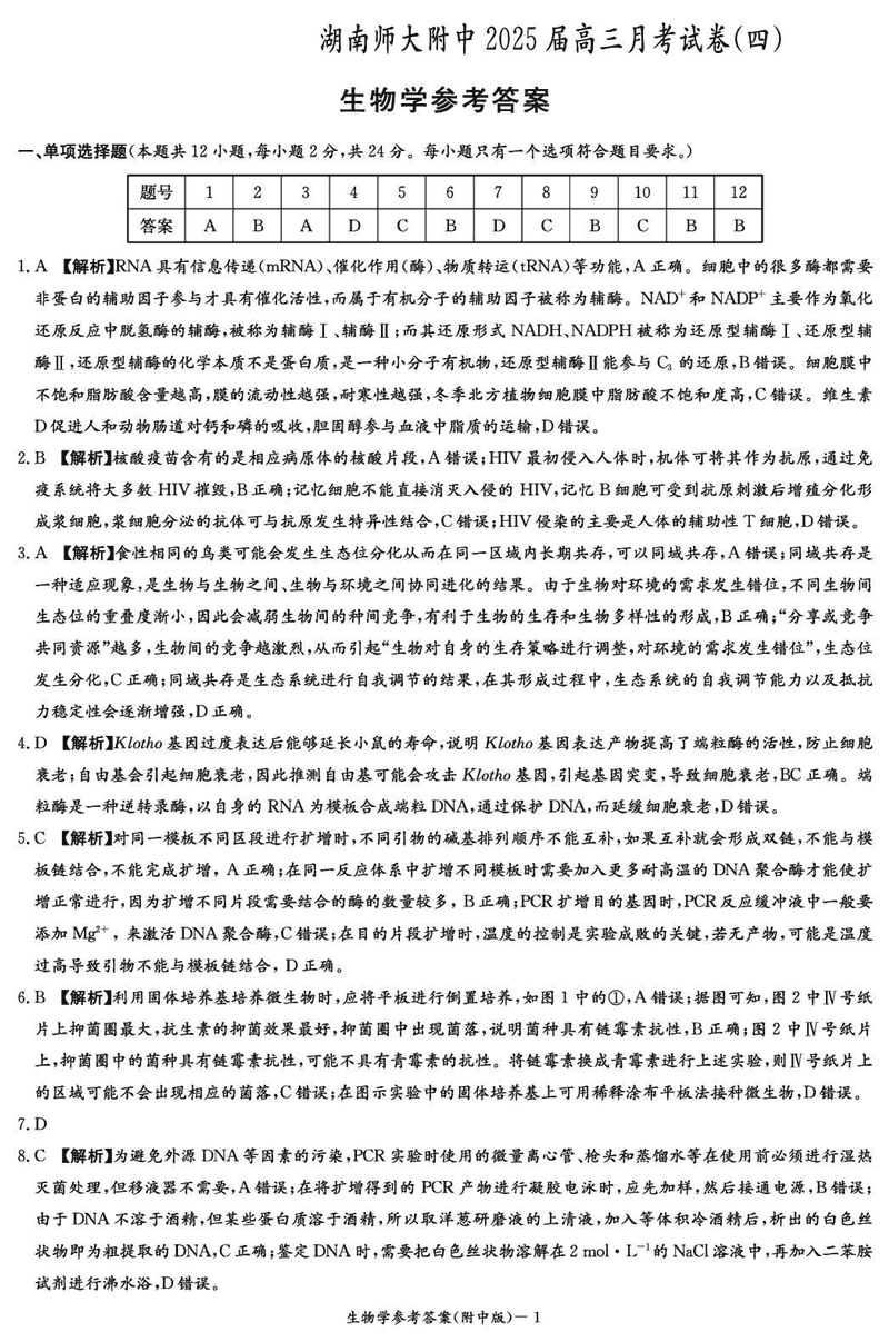 湖南师大附中2025届高三月考试卷(四)生物考试已于近日开考,为方便考生考后及时查看考试情况,查漏补缺、弥补不足,本文整理了试题答案解析相关信息!