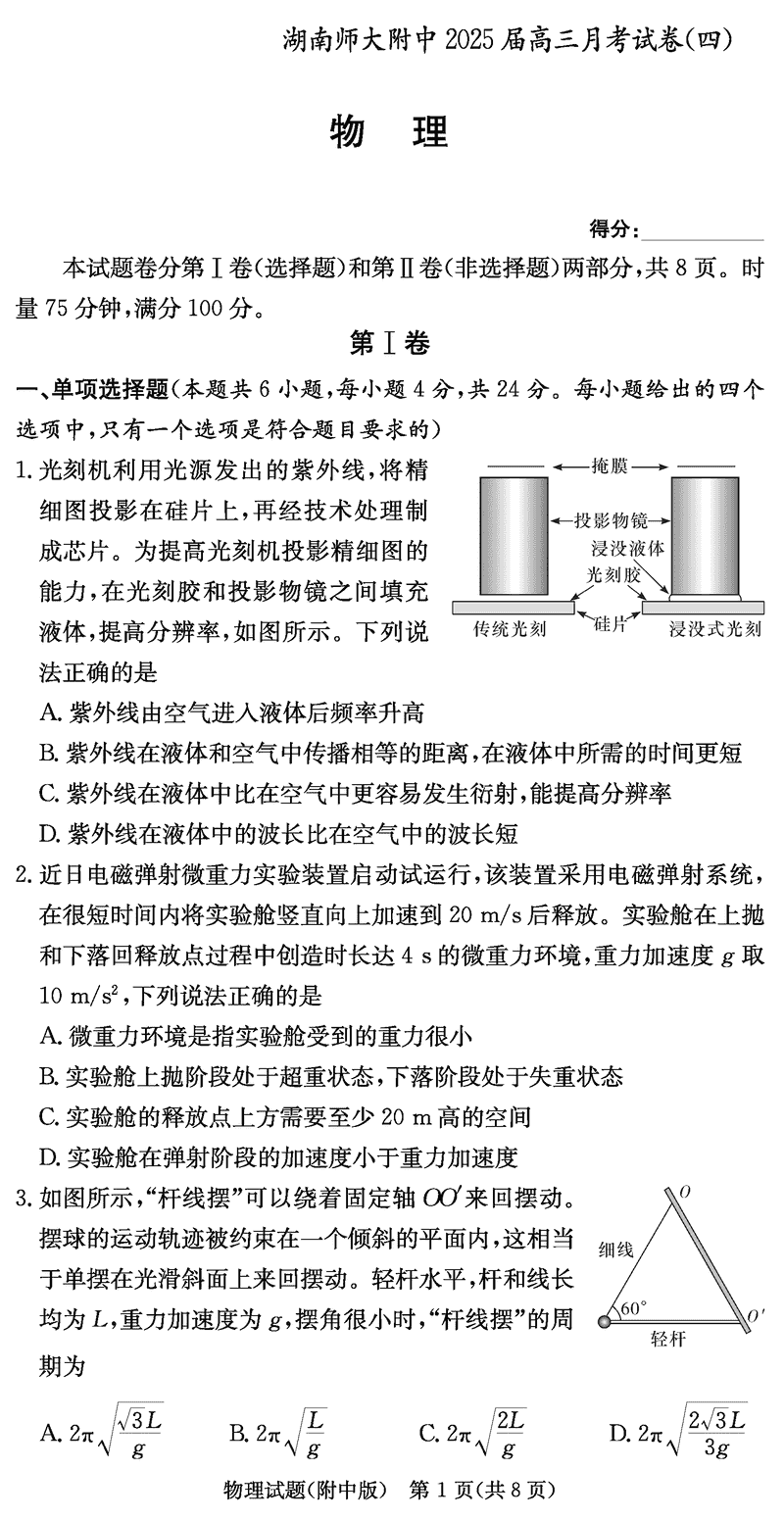 湖南师大附中2025届高三月考试卷(四)物理试题及答案