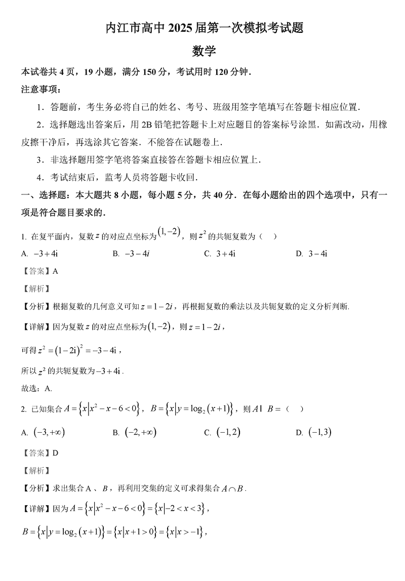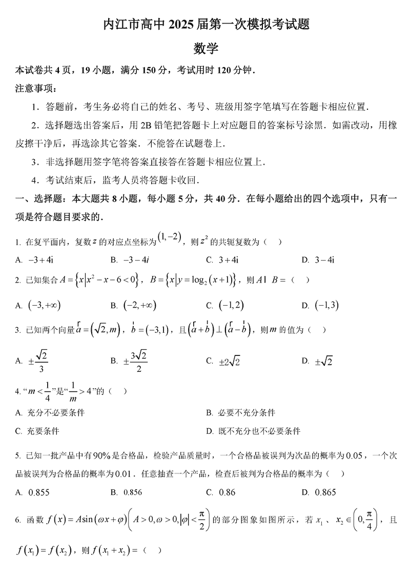 四川内江2025届高三上学期一模数学试题及答案 时间:2024-12-10 22:01 四川 数学试题 四川内江2025届高三上学期一模数学考试已于近日开考,为方便考生考后及时查看考试情况,查漏补缺、弥补不足,本文整理了试题答案解析相关信息! 汇总:四川内江2025届高三上学期一模试题及答案汇总 数学试题及答案解析
