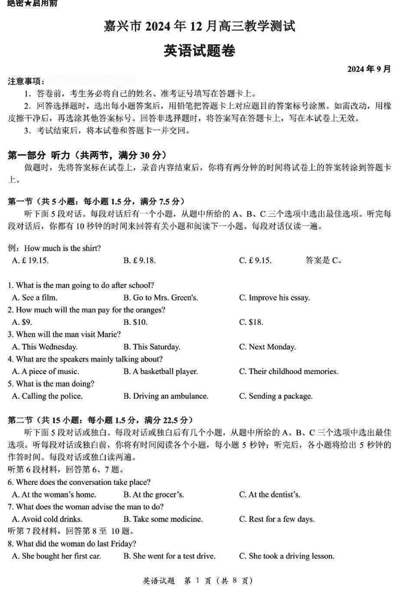 浙江嘉兴一模2024年高三12月教学测试英语试题及答案
