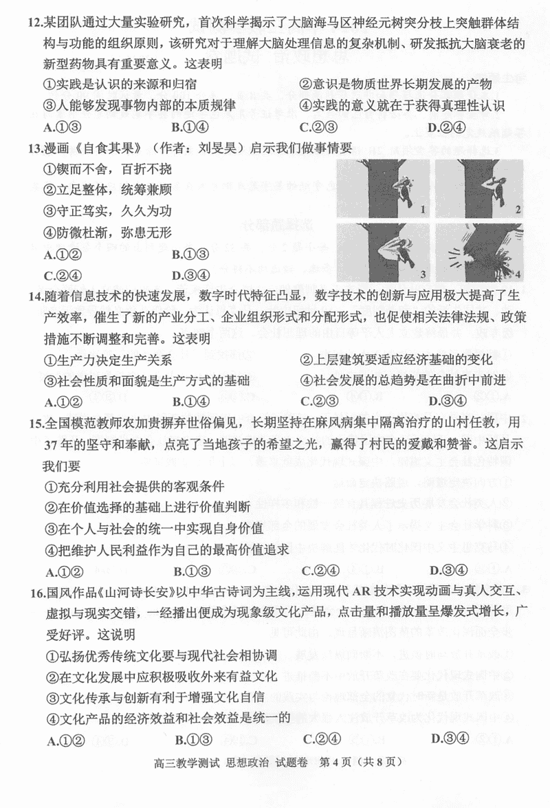 浙江嘉兴一模2024年高三12月教学测试政治试题及答案