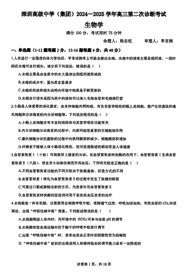 深圳高级中学2024-2025学年高三上学期第二次诊断生物考试已于近日开考,为方便考生考后及时查看考试情况,查漏补缺、弥补不足,本文整理了试题答案解析相关信息!
