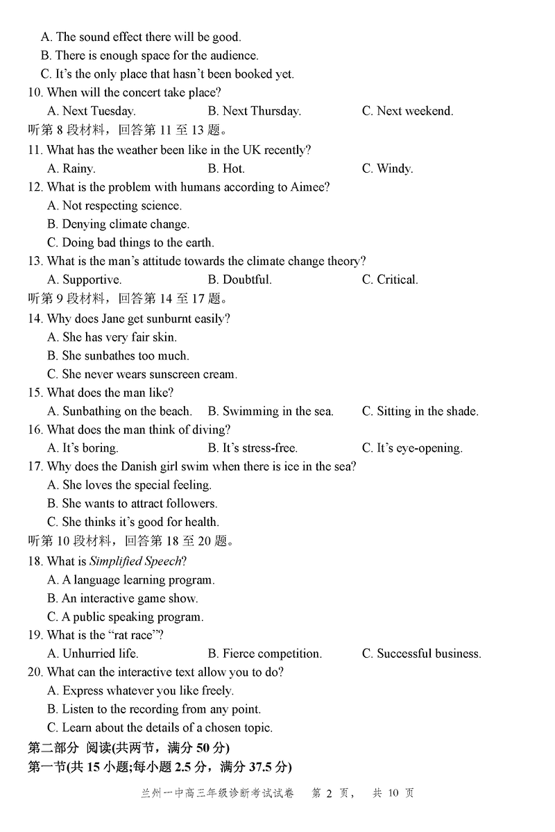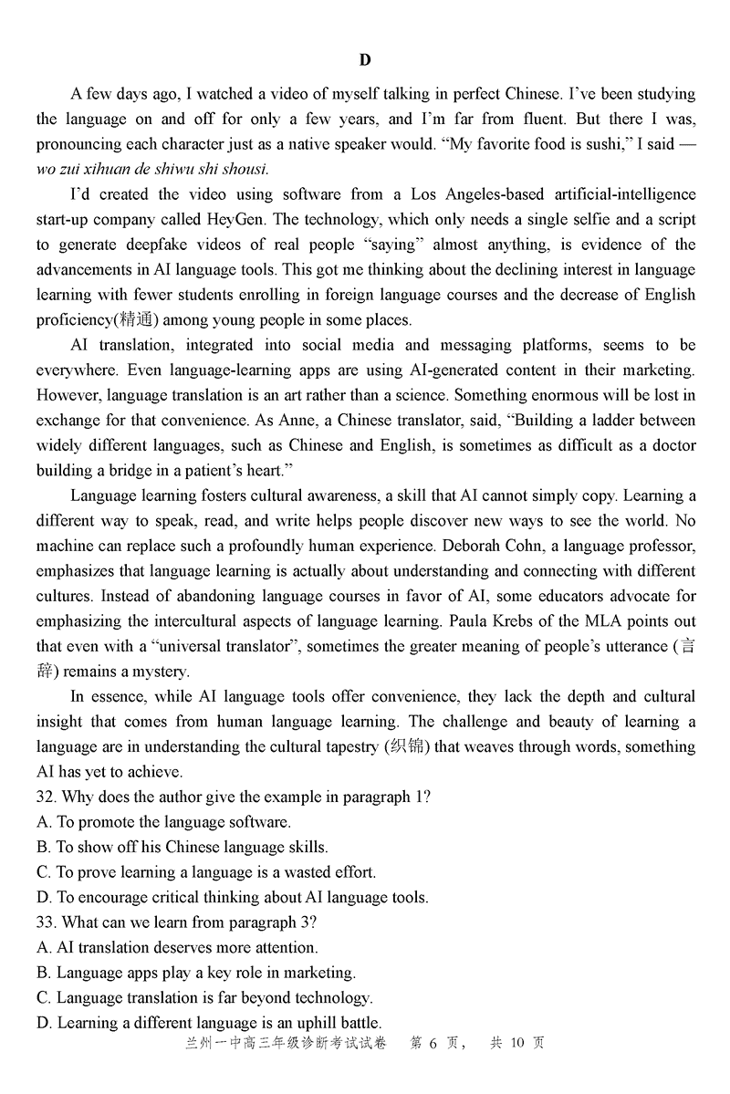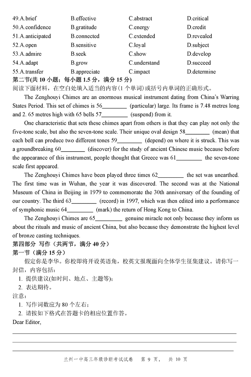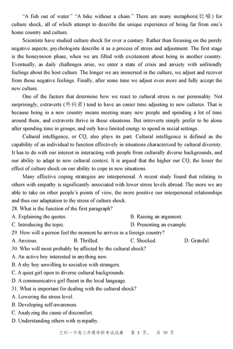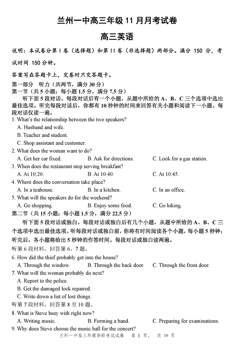 兰州一中2024-2025学年高三上学期12月月考英语考试已于近日开考,为方便考生考后及时查看考试情况,查漏补缺、弥补不足,本文整理了试题答案解析相关信息!
