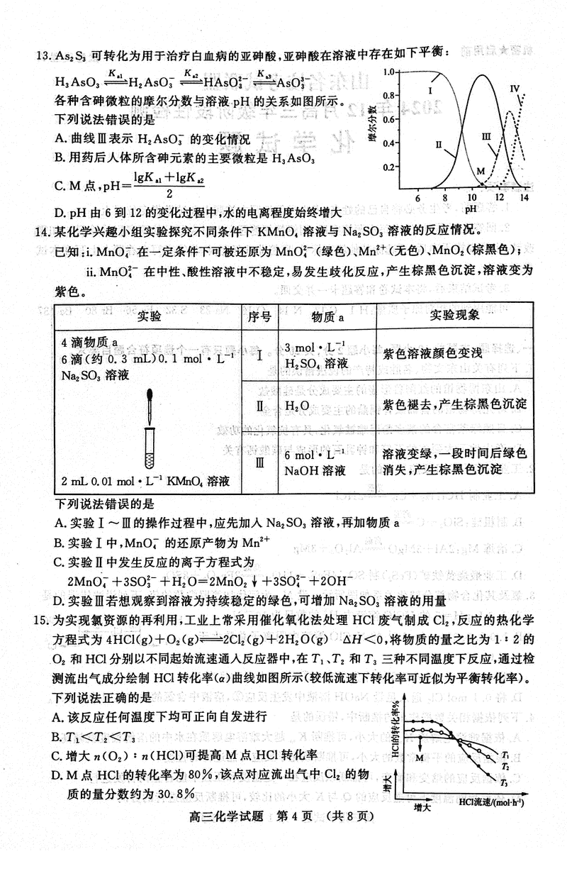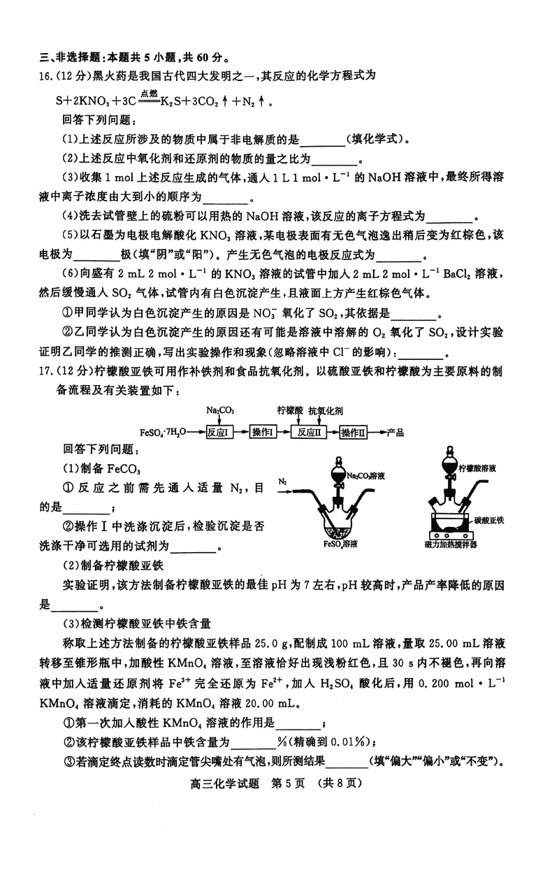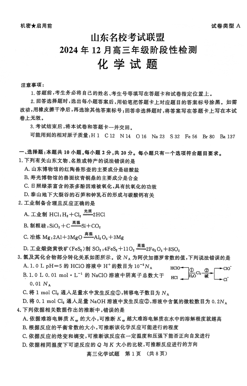 山东名校考试联盟2024年12月高三阶段测化学试题及答案
