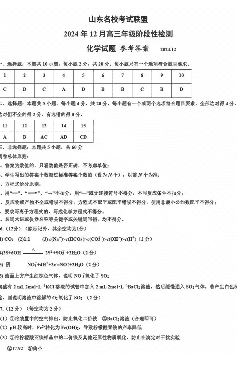 山东名校考试联盟2024年12月高三阶段测化学考试已于近日开考,为方便考生考后及时查看考试情况,查漏补缺、弥补不足,本文整理了试题答案解析相关信息!