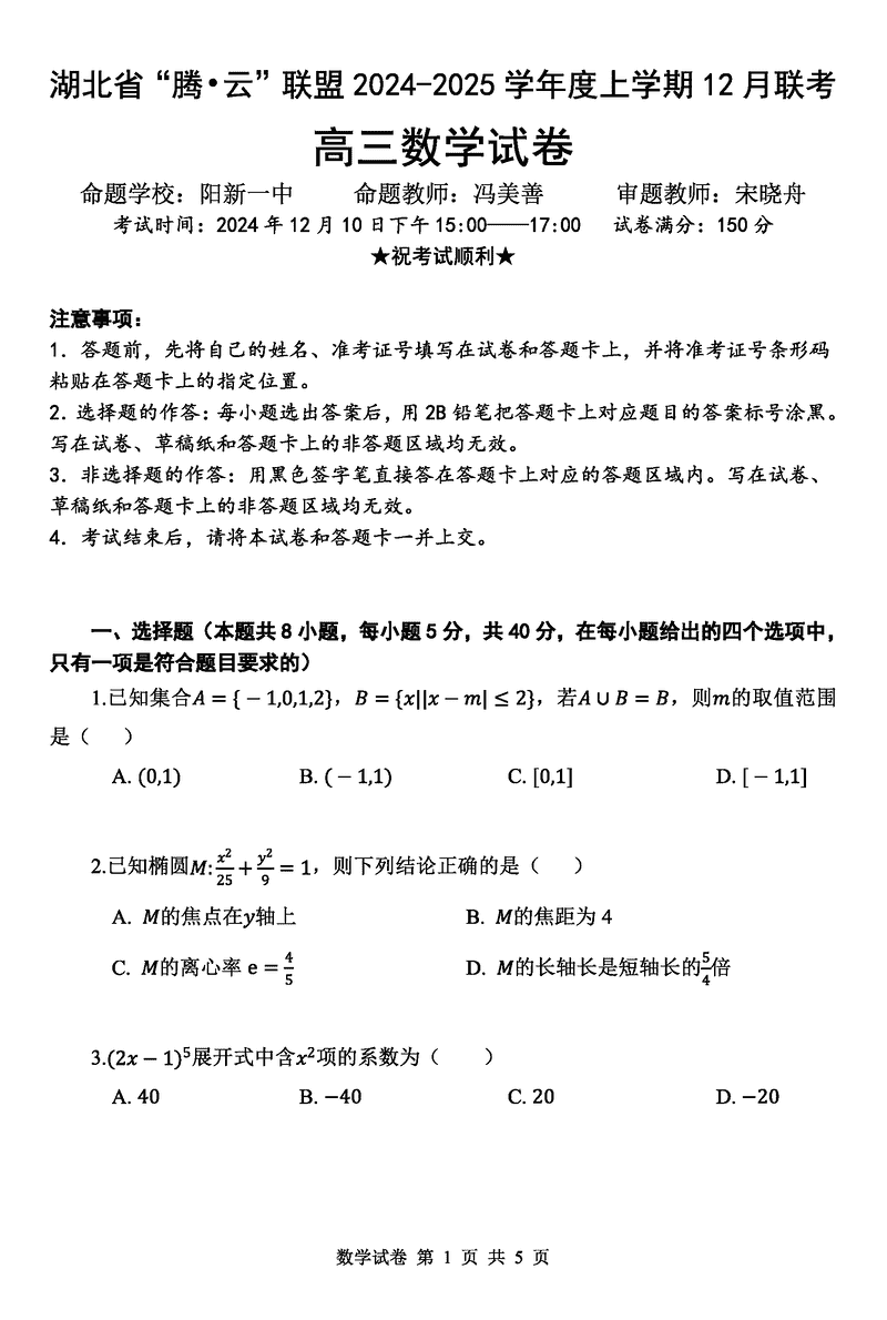 湖北省腾云联盟2025届高三12月联考数学试题及答案 时间:2024-12-12 12:33 湖北 数学试题 湖北省腾云联盟2025届高三12月联考数学考试已于近日开考,为方便考生考后及时查看考试情况,查漏补缺、弥补不足,本文整理了试题答案解析相关信息! 汇总:湖北省腾云联盟2025届高三12月联考试题及答案汇总 数学试题及答案解析