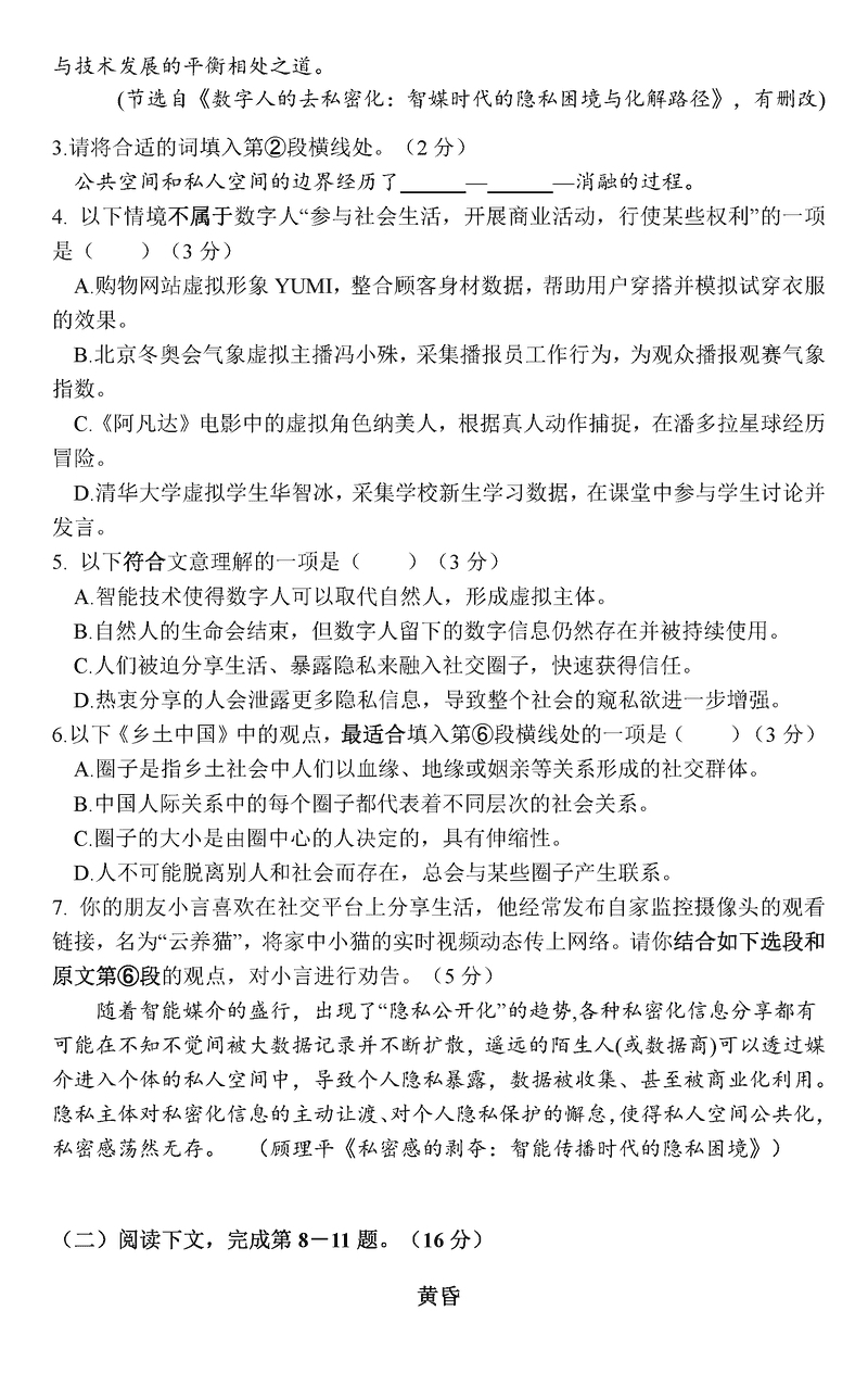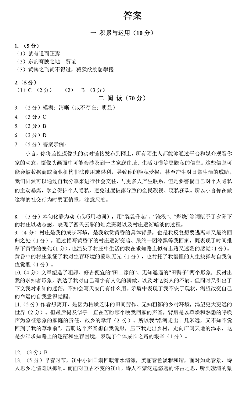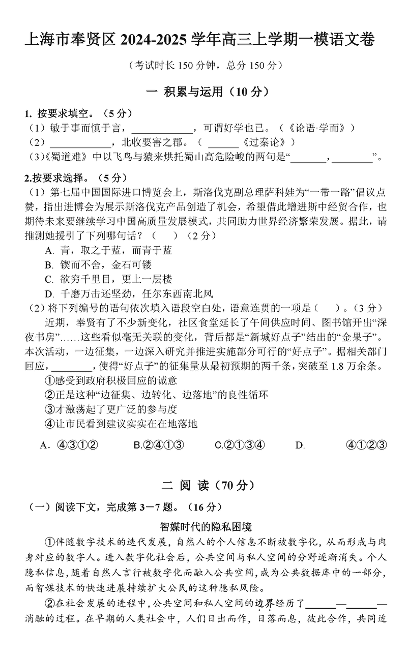 上海市奉贤区2025届高三上学期一模语文试题及答案 时间:2024-12-17 06:05 上海 语文试题 上海市奉贤区2025届高三上学期一模语文考试已于近日开考,为方便考生考后及时查看考试情况,查漏补缺、弥补不足,本文整理了试题答案解析相关信息! 汇总:上海市奉贤区2025届高三上学期一模试题及答案汇总 语文试题及答案解析