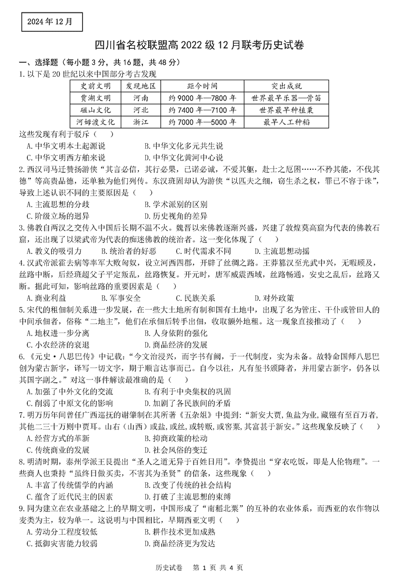 四川省名校联盟2025届高三12月联考历史试题及答案 时间:2024-12-18 11:22 四川 文综试题 四川省名校联盟2025届高三12月联考历史考试已于近日开考,为方便考生考后及时查看考试情况,查漏补缺、弥补不足,本文整理了试题答案解析相关信息! 汇总:四川省名校联盟2025届高三12月联考试题及答案汇总 历史试题及答案解析