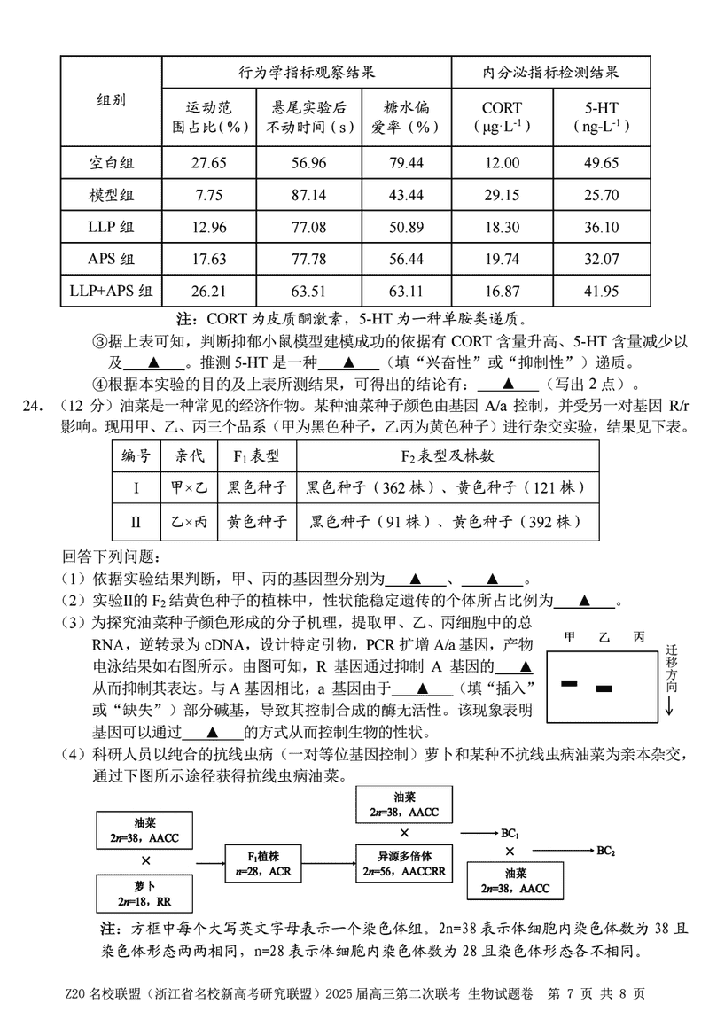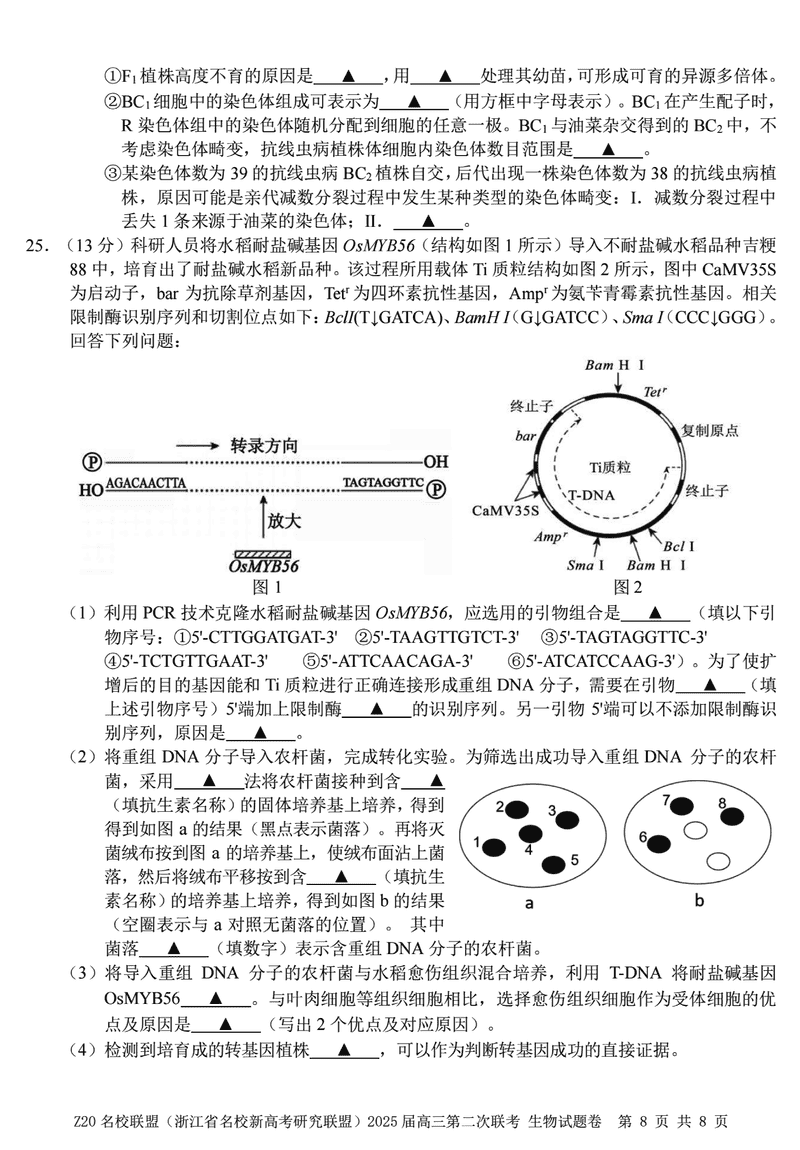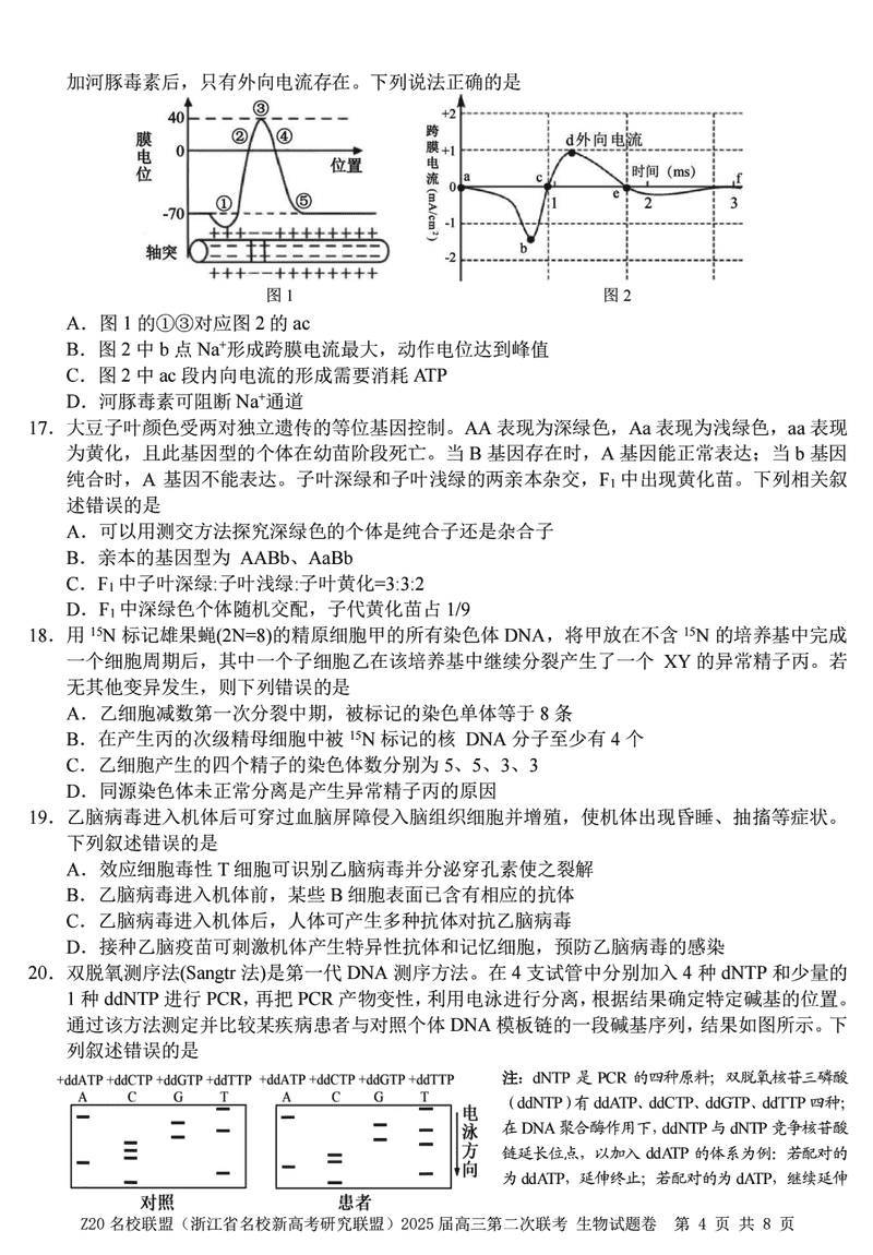 浙江Z20名校联盟2025届高三上学期第二次联考生物试题及答案