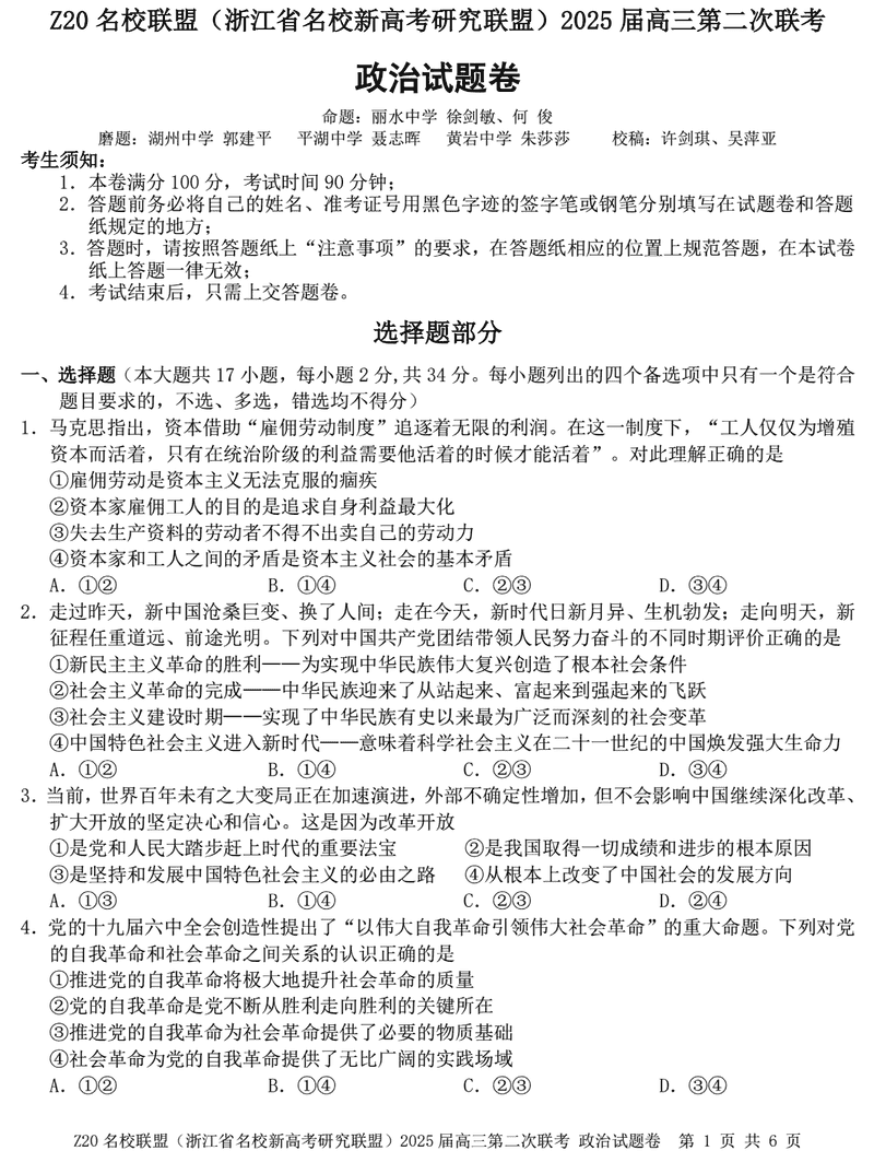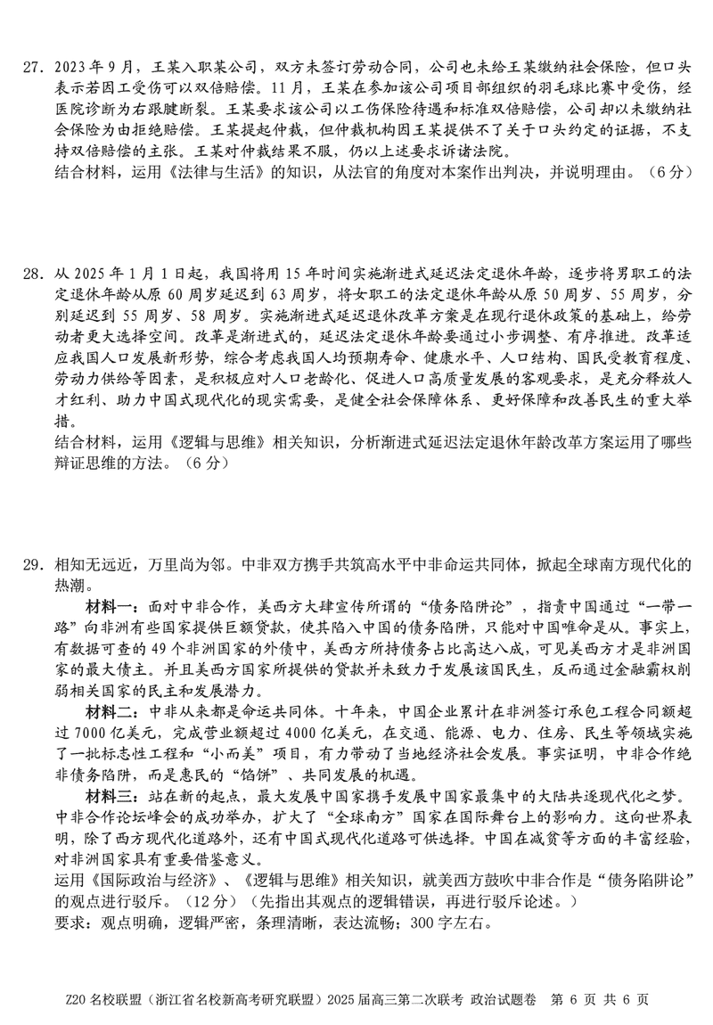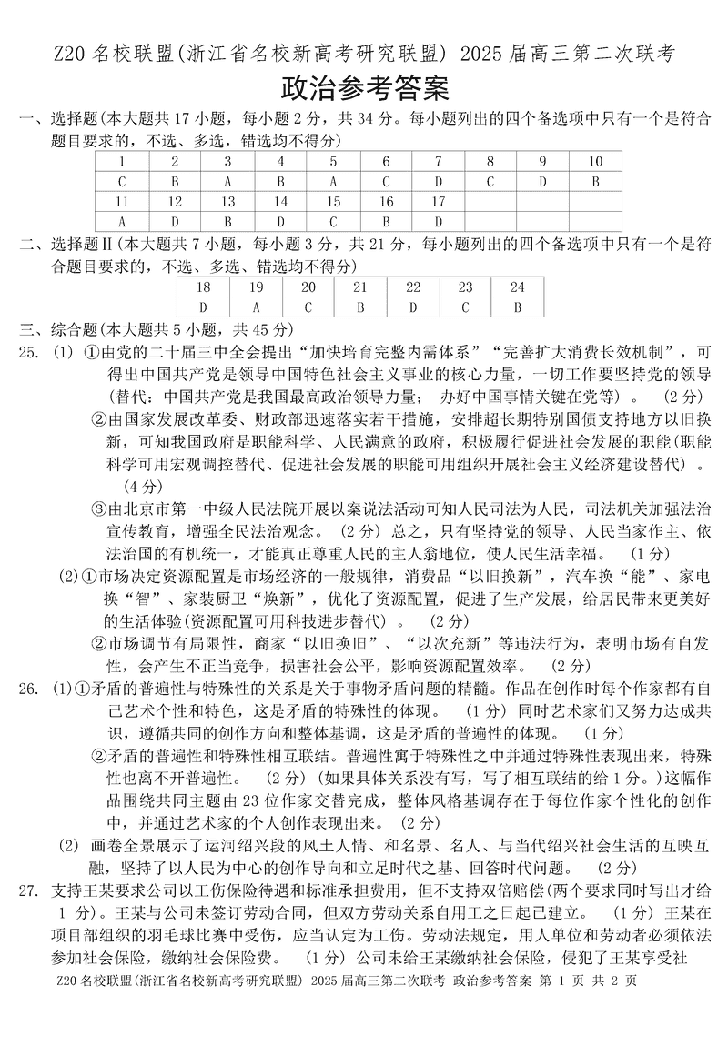 浙江Z20名校联盟2025届高三上学期第二次联考政治试题及答案