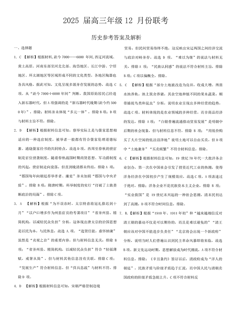 广东衡水金卷2025届高三上学期12月联考历史试题及答案