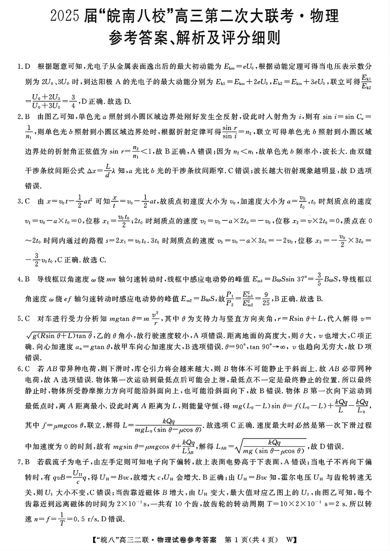 皖南八校2025届高三上学期第二次大联考物理考试已于近日开考,为方便考生考后及时查看考试情况,查漏补缺、弥补不足,本文整理了试题答案解析相关信息!