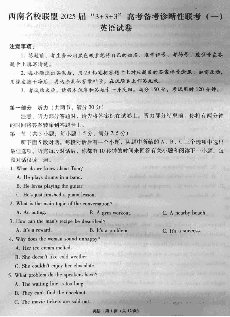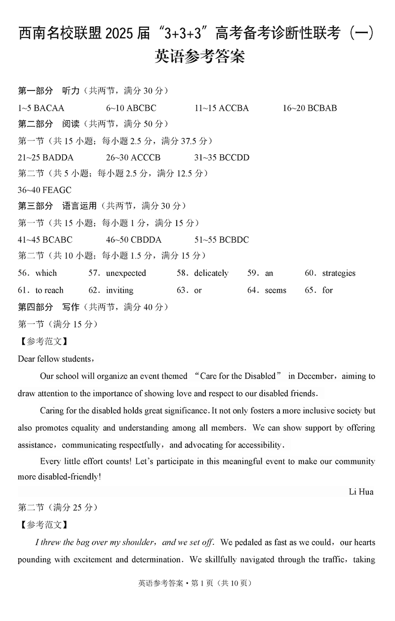 西南名校联盟2025届高三3+3+3诊断性联考(一)英语考试已于近日开考,为方便考生考后及时查看考试情况,查漏补缺、弥补不足,本文整理了试题答案解析相关信息!