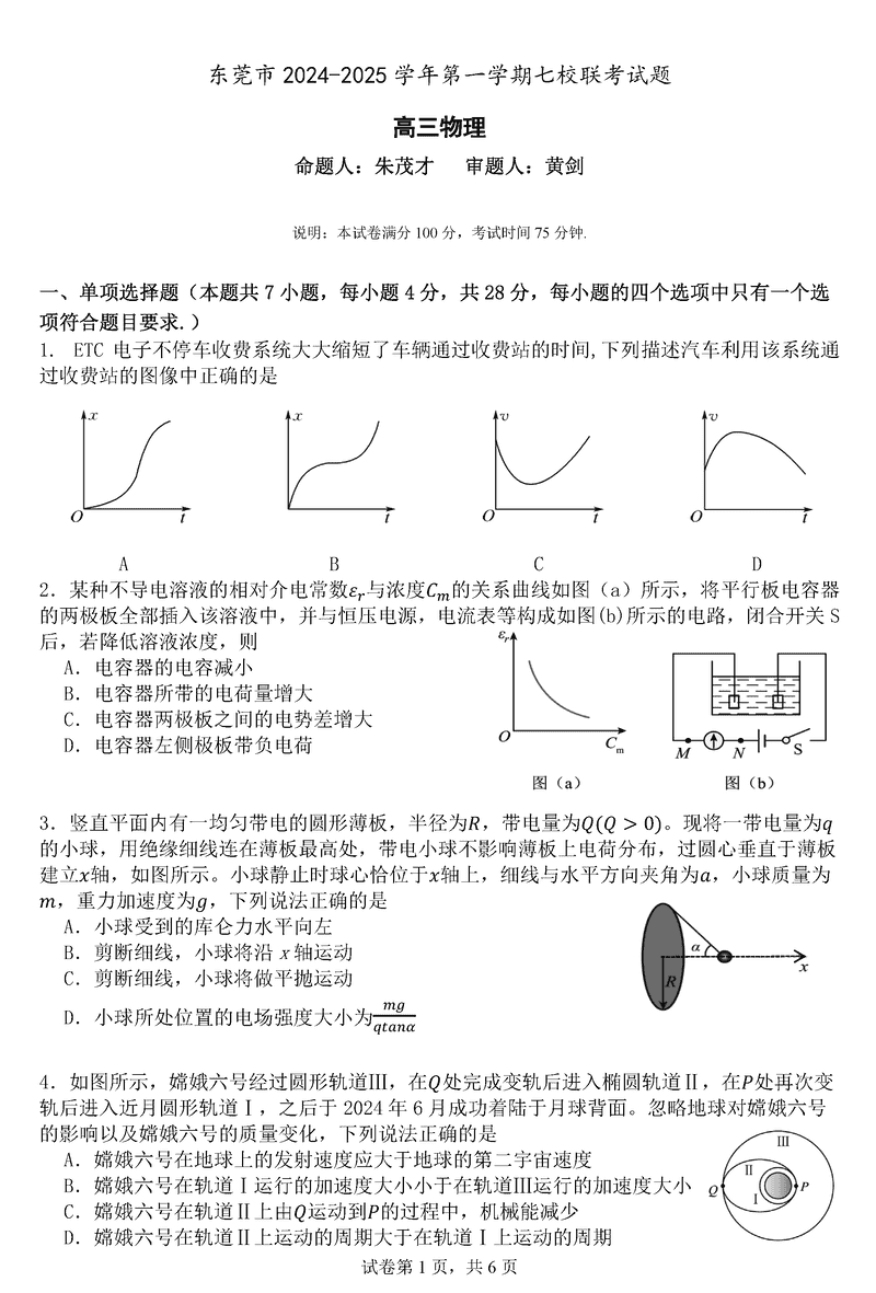 东莞七校联考2025届高三上学期12月月考物理试题及答案