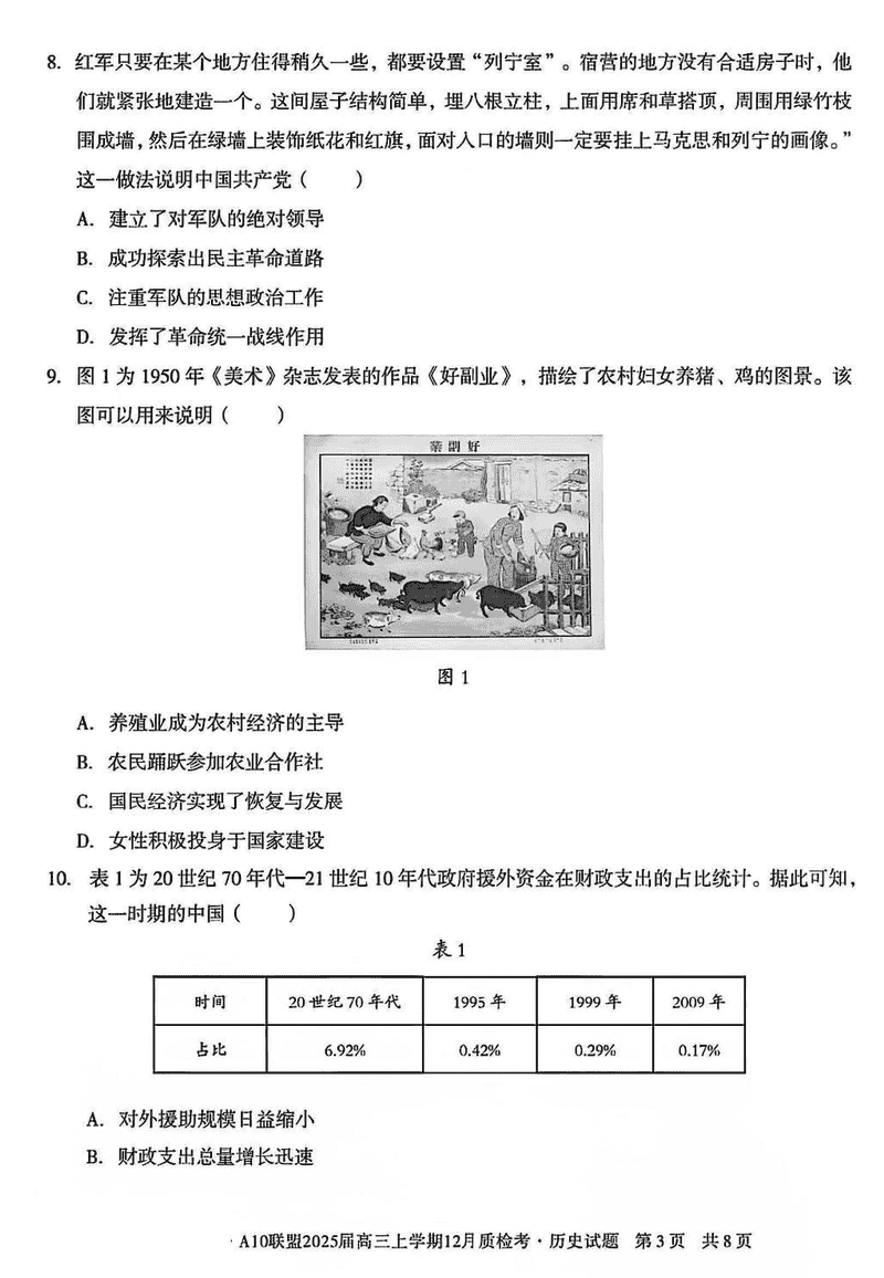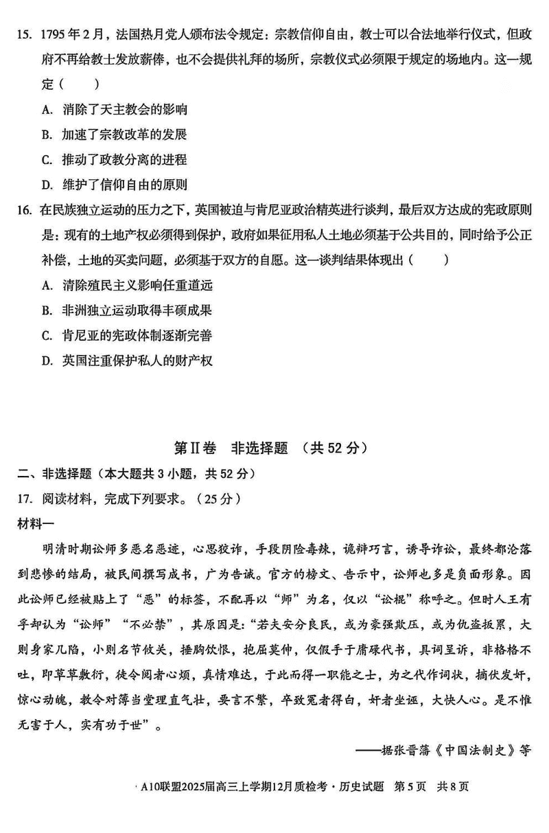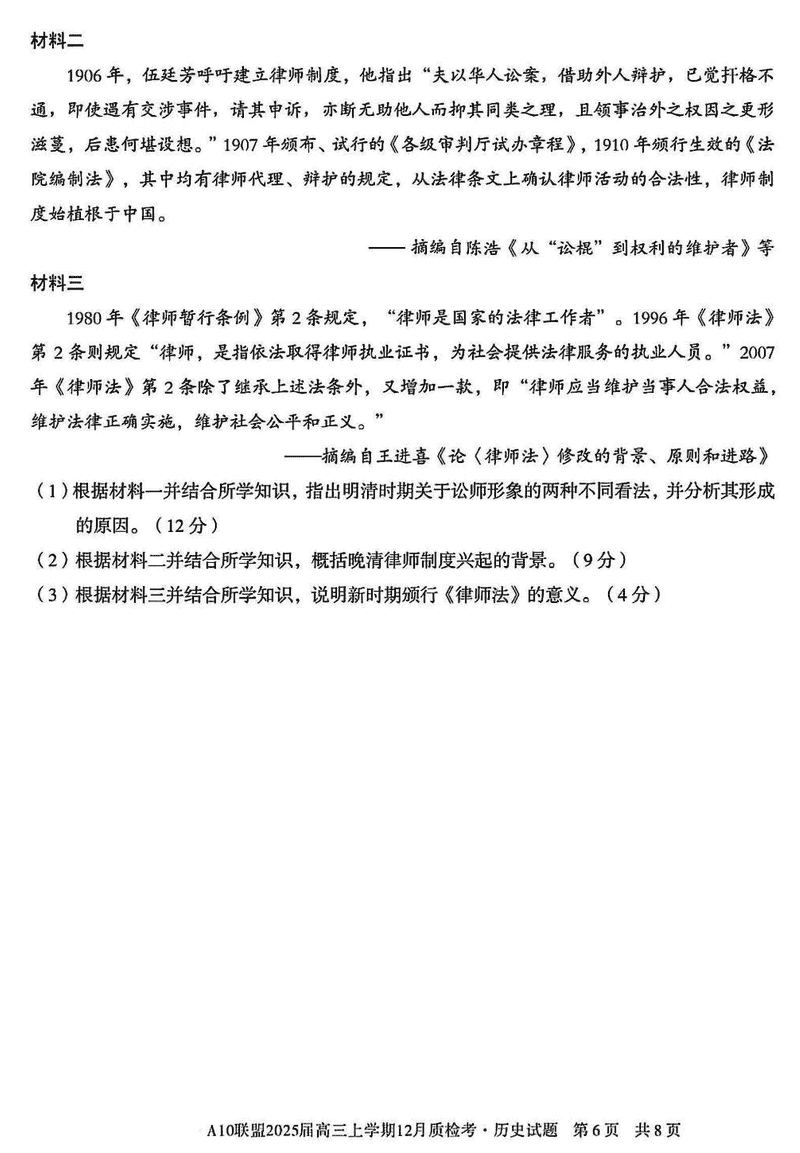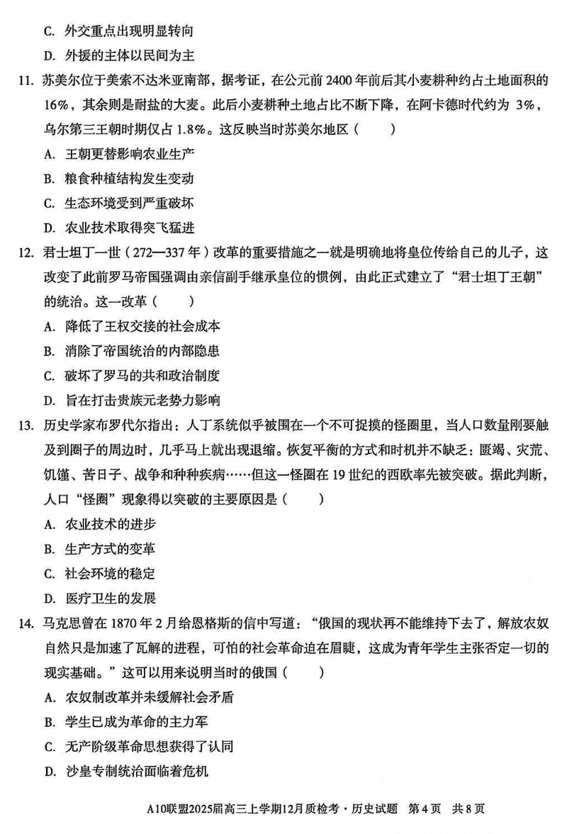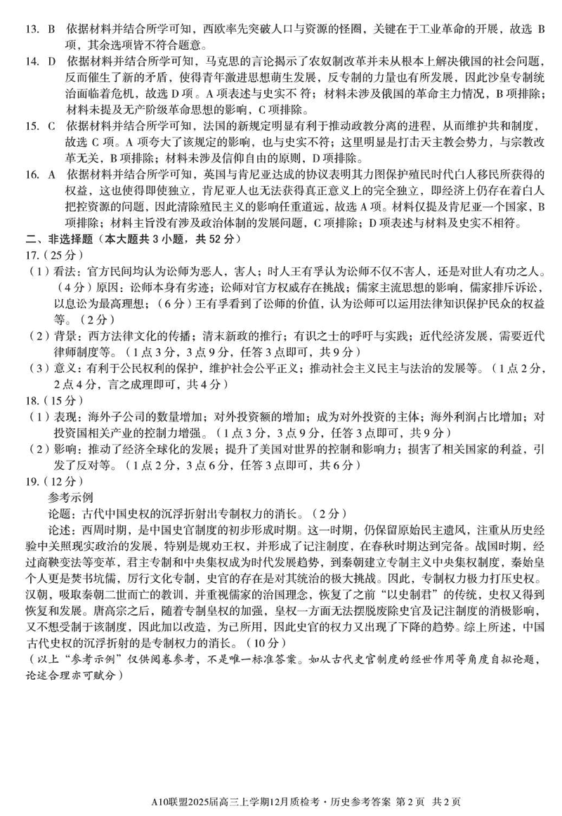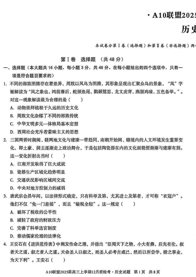 安徽省1号卷A10联盟2025届高三上学期12月质检历史试题及答案