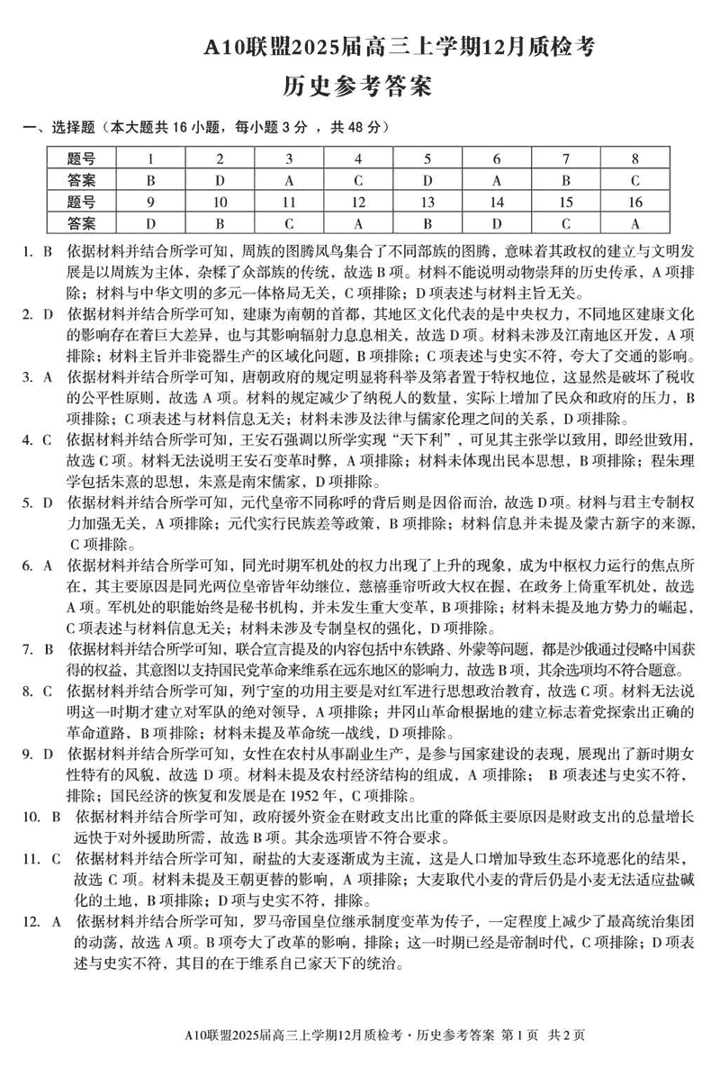 安徽省1号卷A10联盟2025届高三上学期12月质检历史考试已于近日开考,为方便考生考后及时查看考试情况,查漏补缺、弥补不足,本文整理了试题答案解析相关信息!