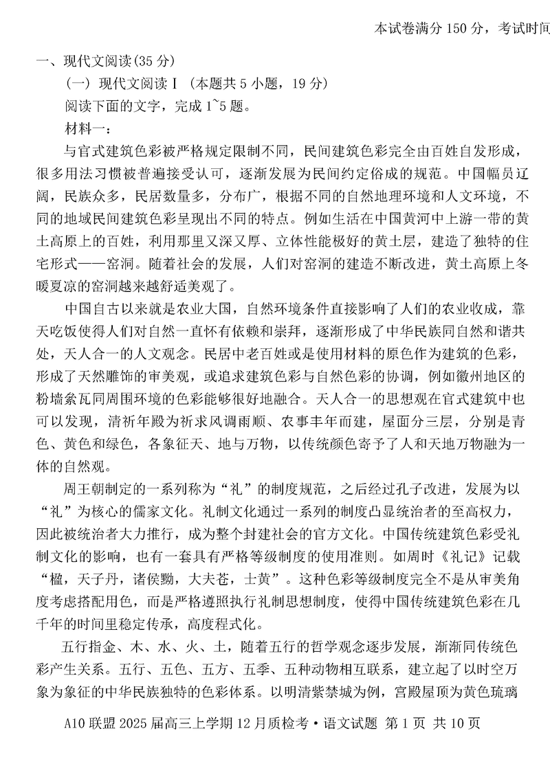 安徽省1号卷A10联盟2025届高三上学期12月质检语文考试已于近日开考,为方便考生考后及时查看考试情况,查漏补缺、弥补不足,本文整理了试题答案解析相关信息!