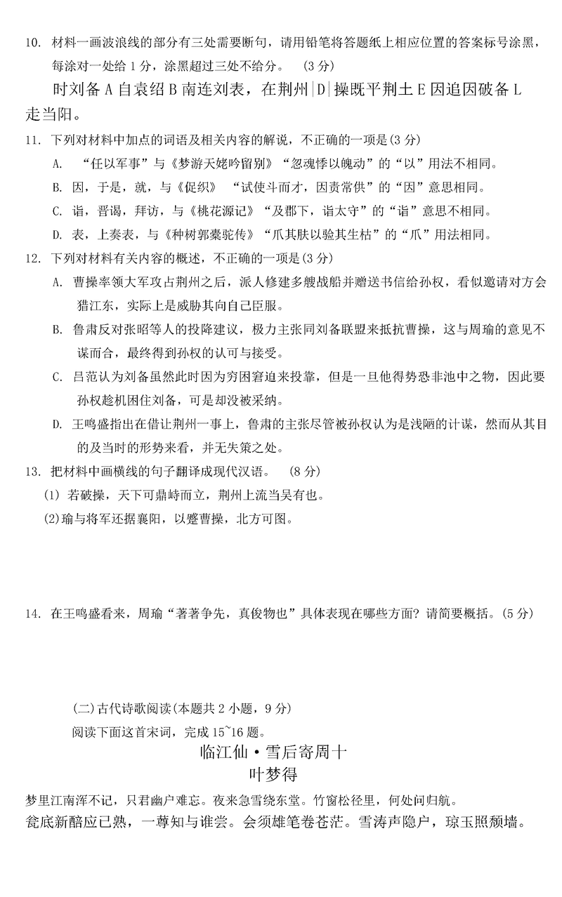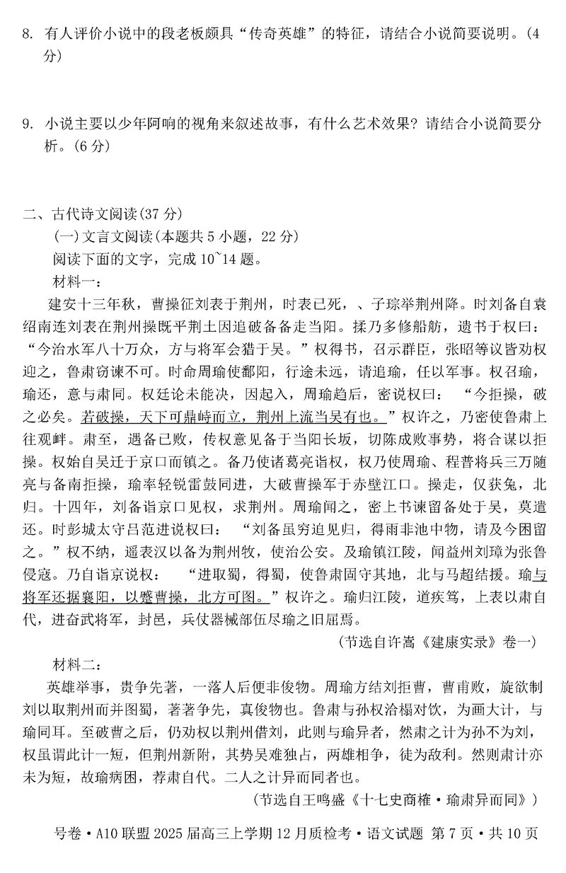 安徽省1号卷A10联盟2025届高三上学期12月质检语文试题及答案