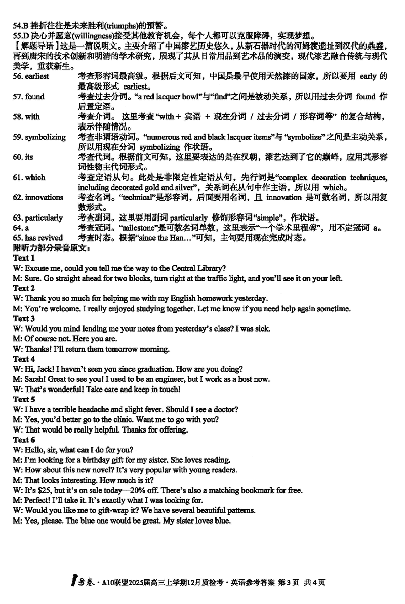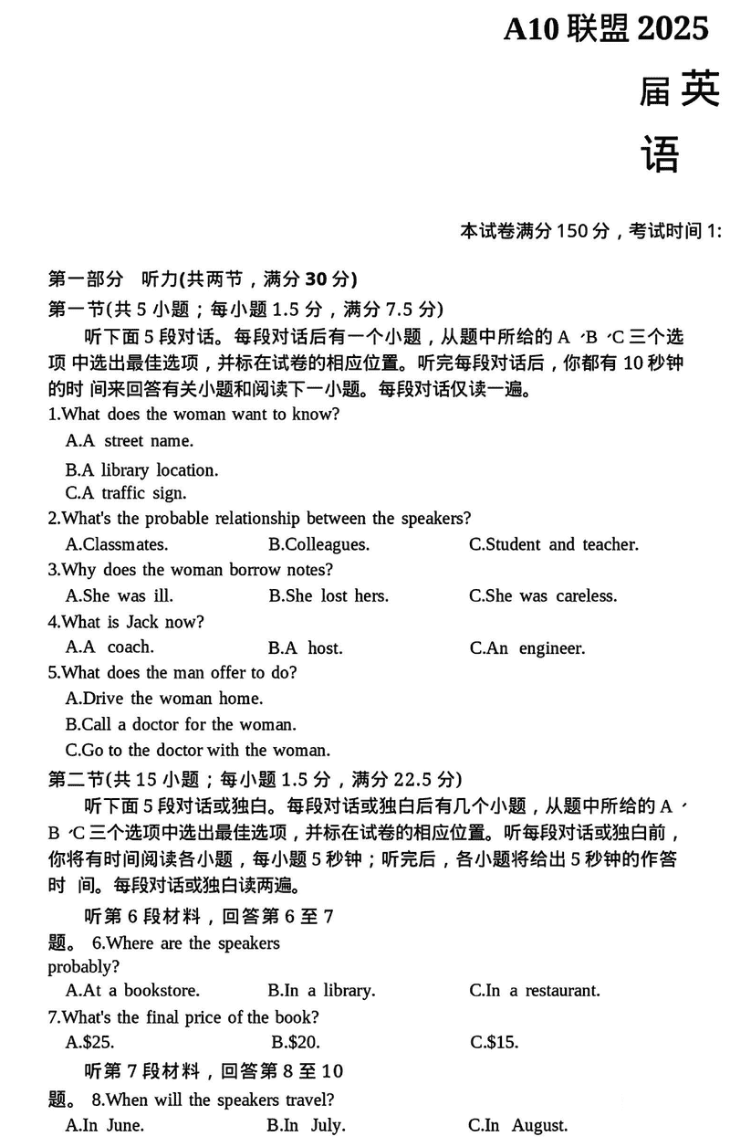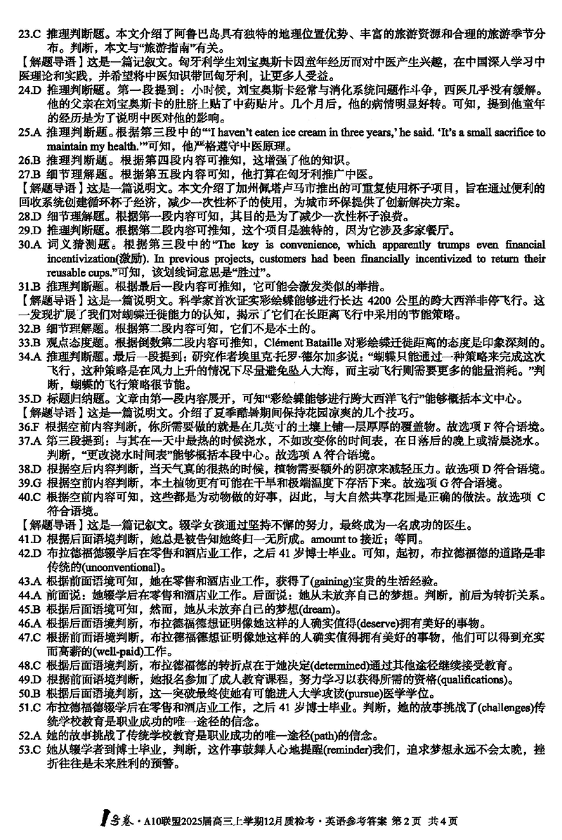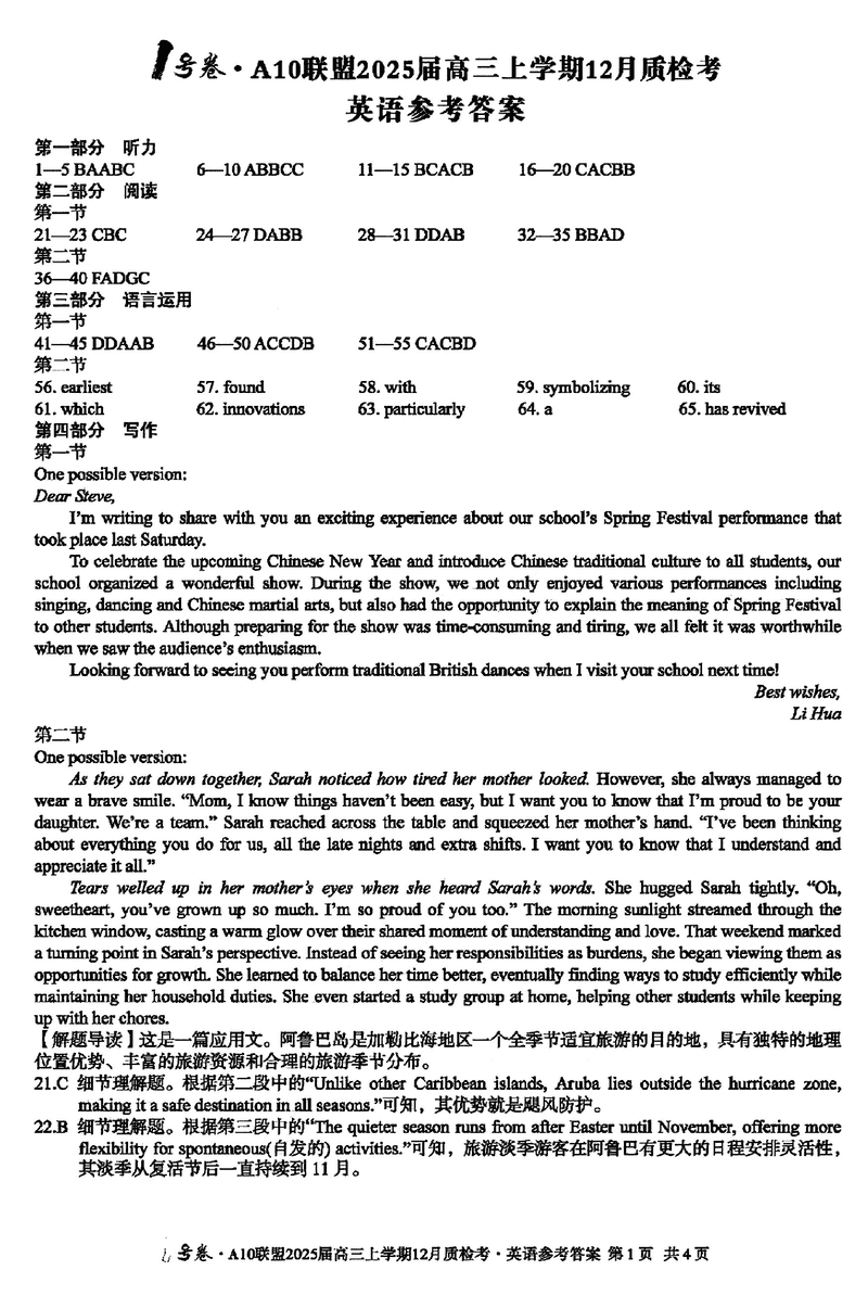 安徽省1号卷A10联盟2025届高三上学期12月质检英语考试已于近日开考,为方便考生考后及时查看考试情况,查漏补缺、弥补不足,本文整理了试题答案解析相关信息!