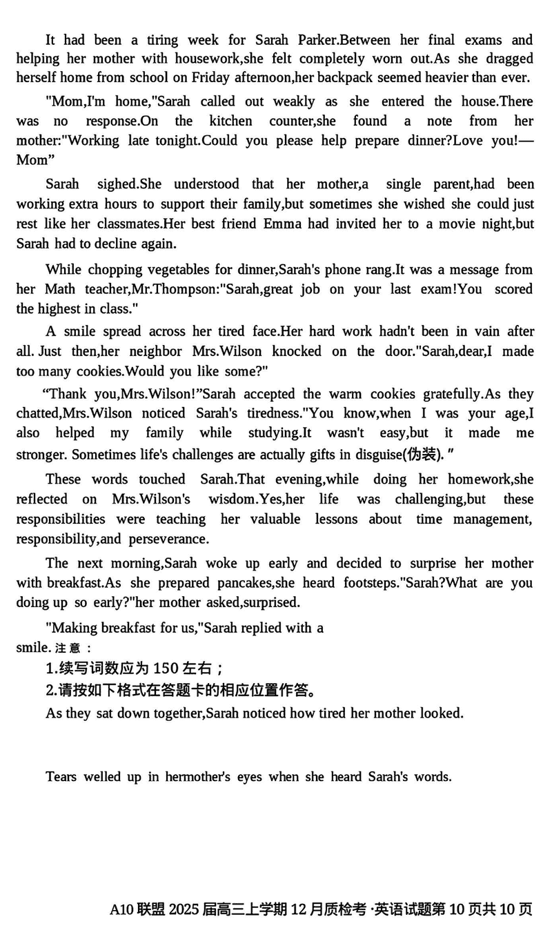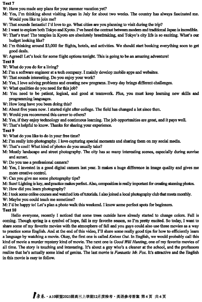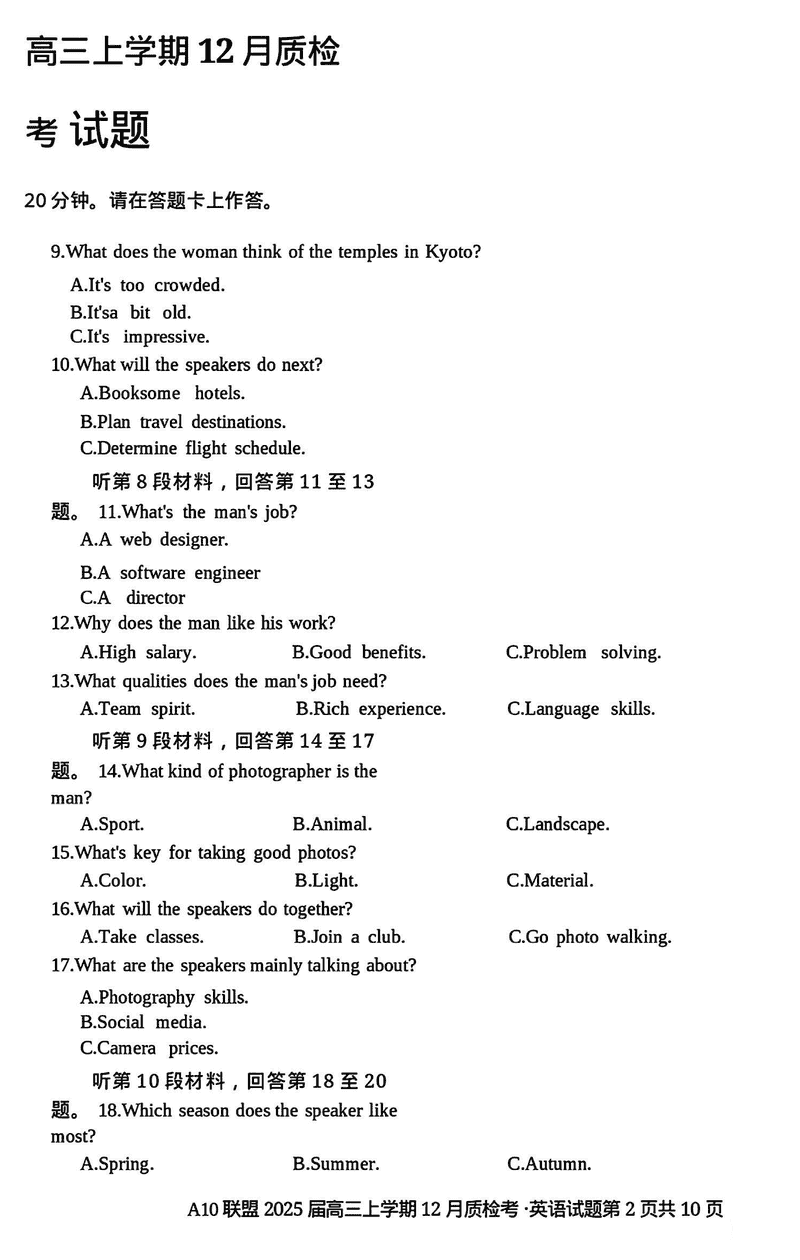 安徽省1号卷A10联盟2025届高三上学期12月质检英语考试已于近日开考,为方便考生考后及时查看考试情况,查漏补缺、弥补不足,本文整理了试题答案解析相关信息!