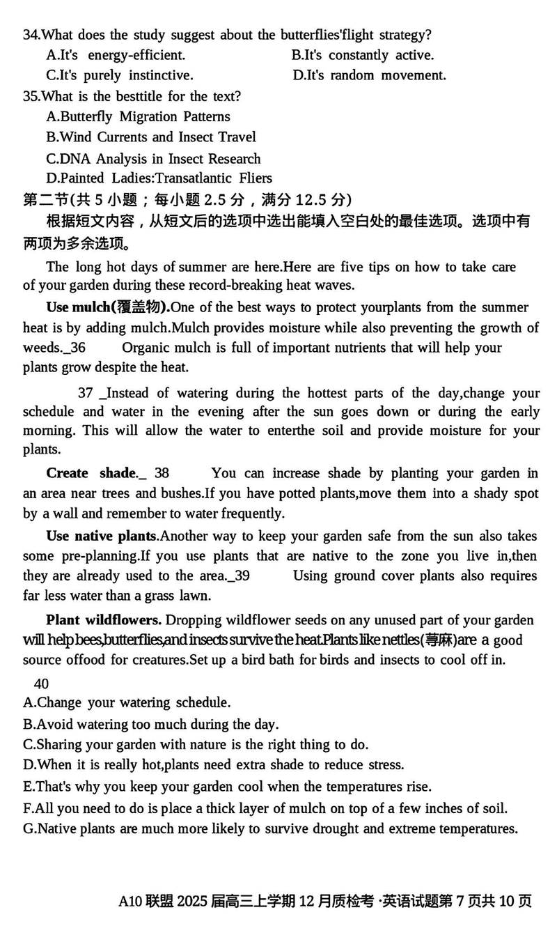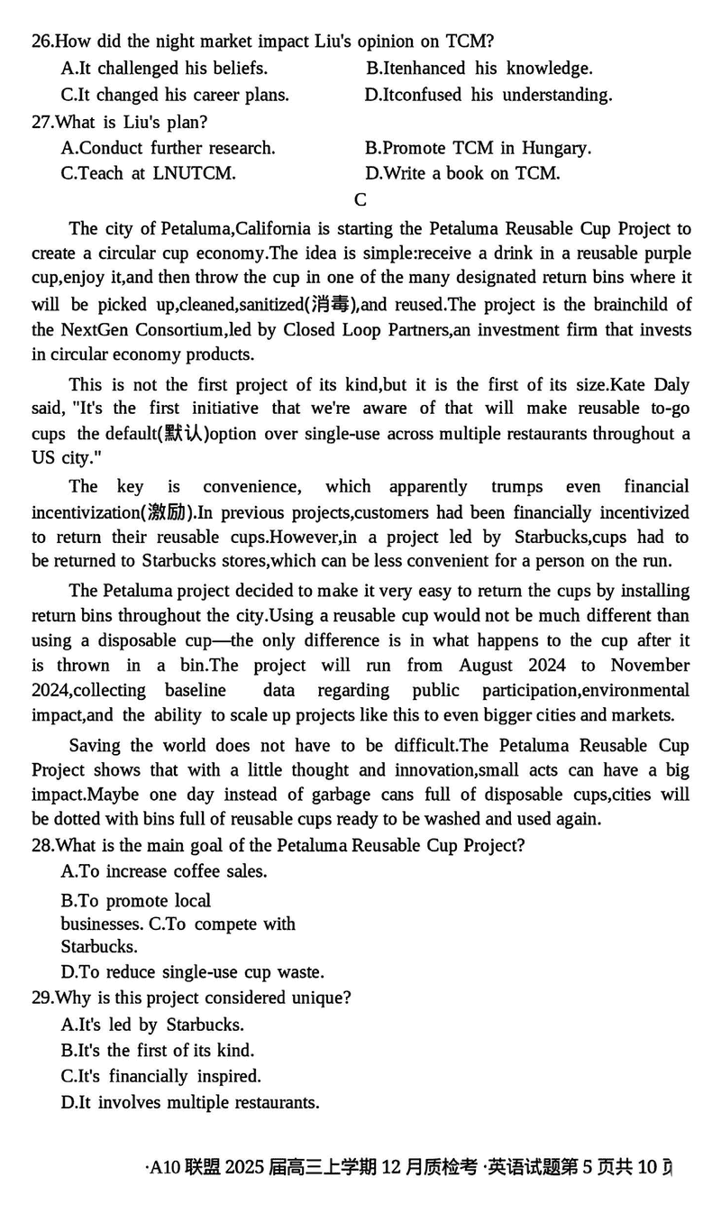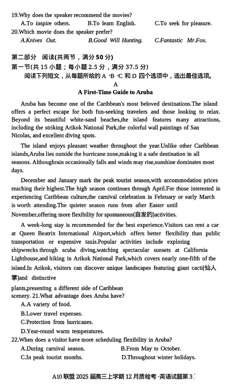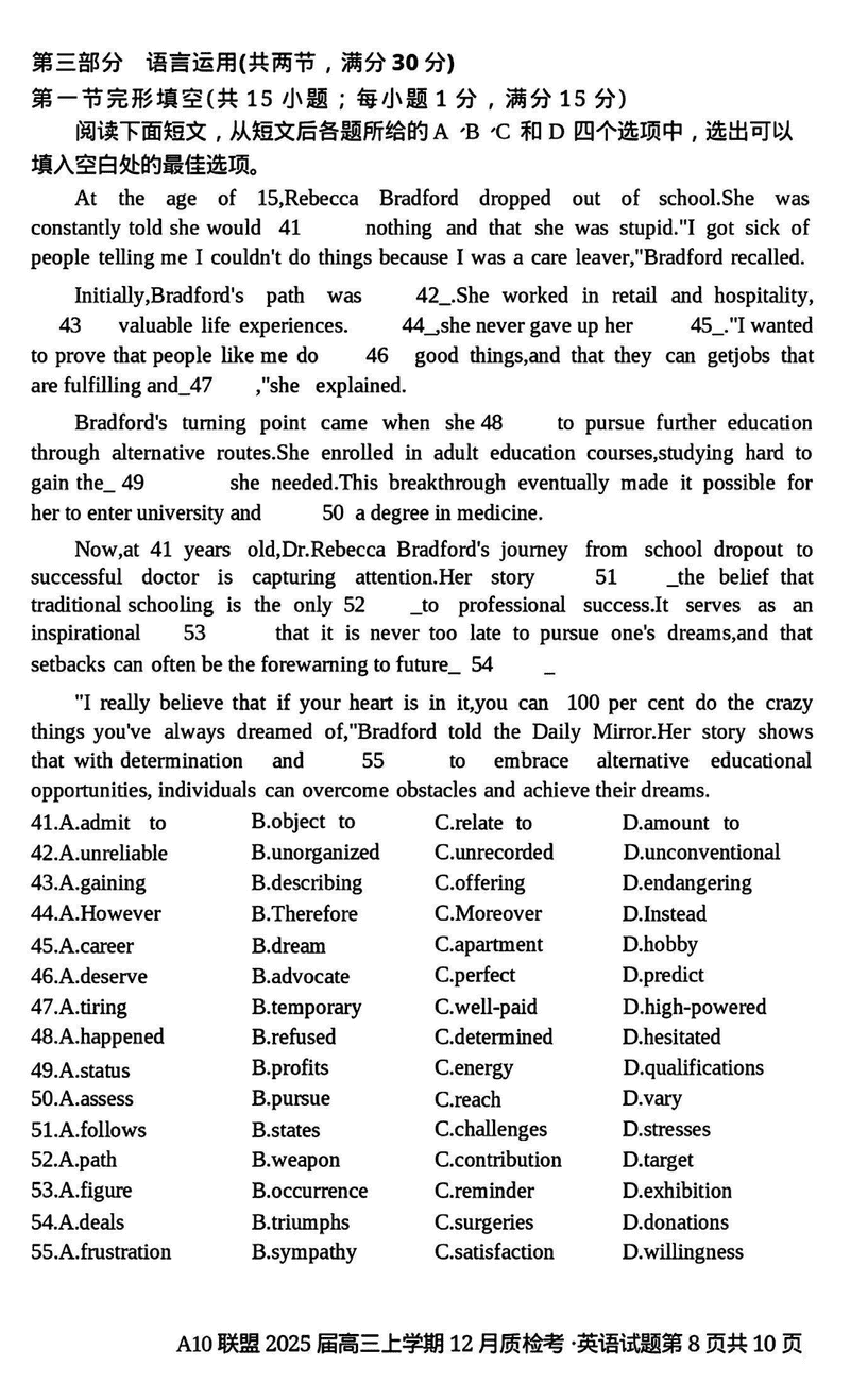 安徽省1号卷A10联盟2025届高三上学期12月质检英语试题及答案
