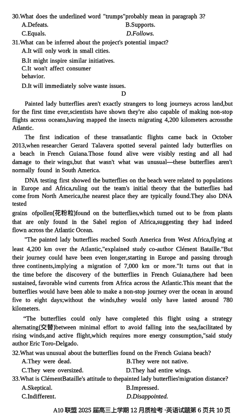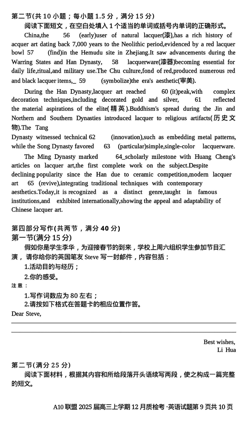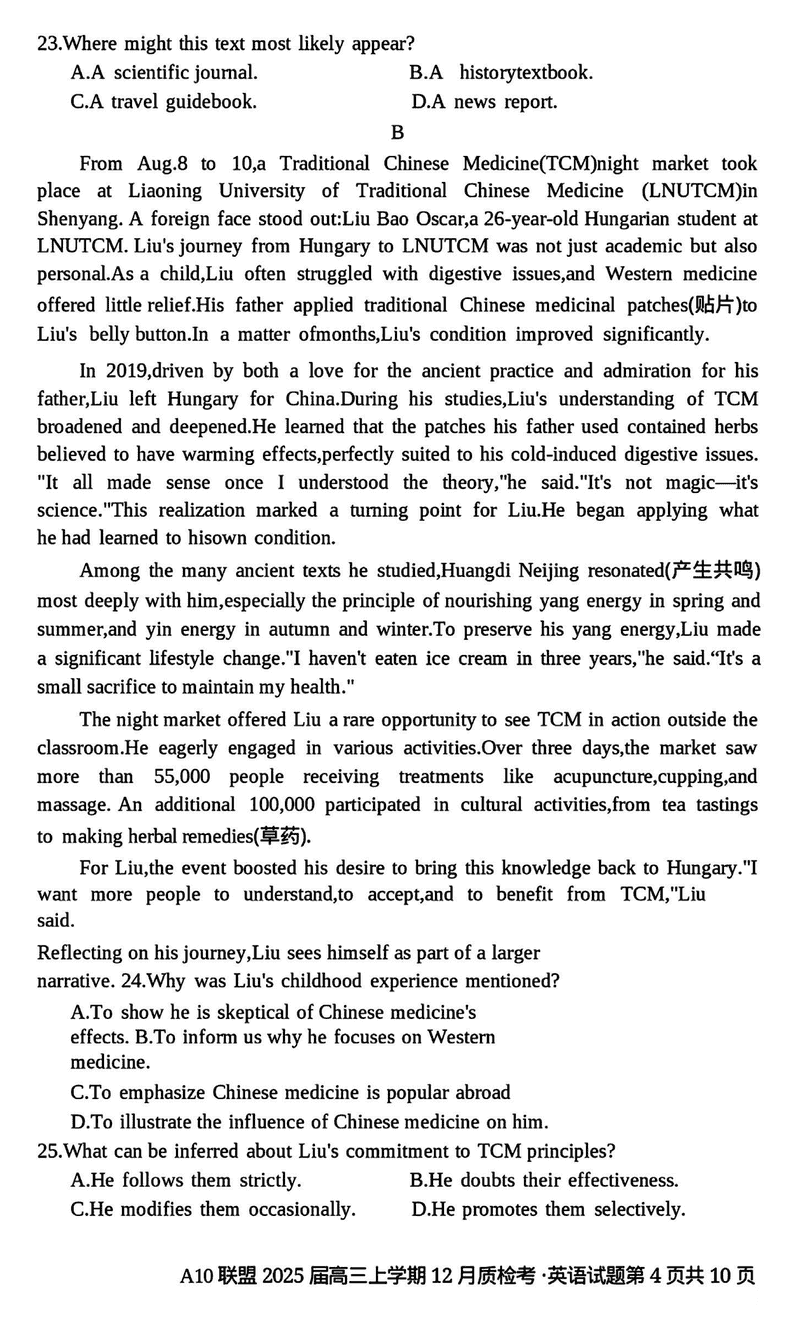 安徽省1号卷A10联盟2025届高三上学期12月质检英语试题及答案