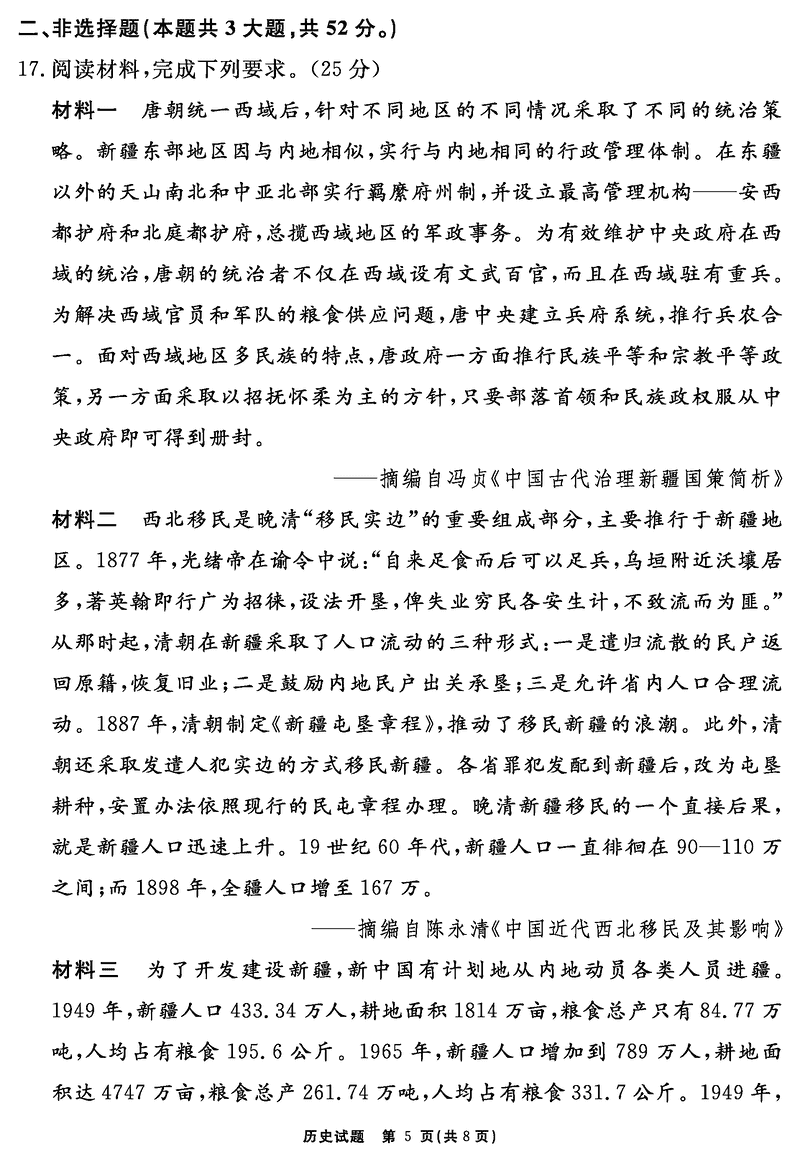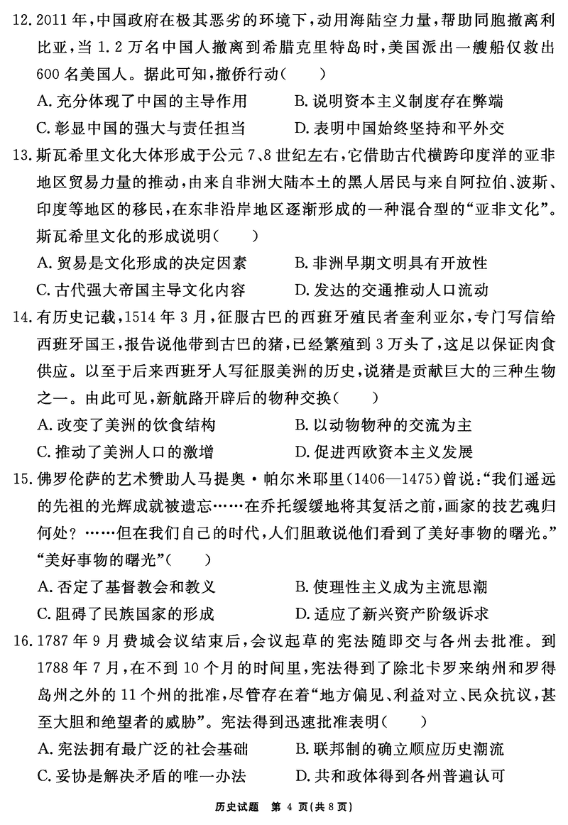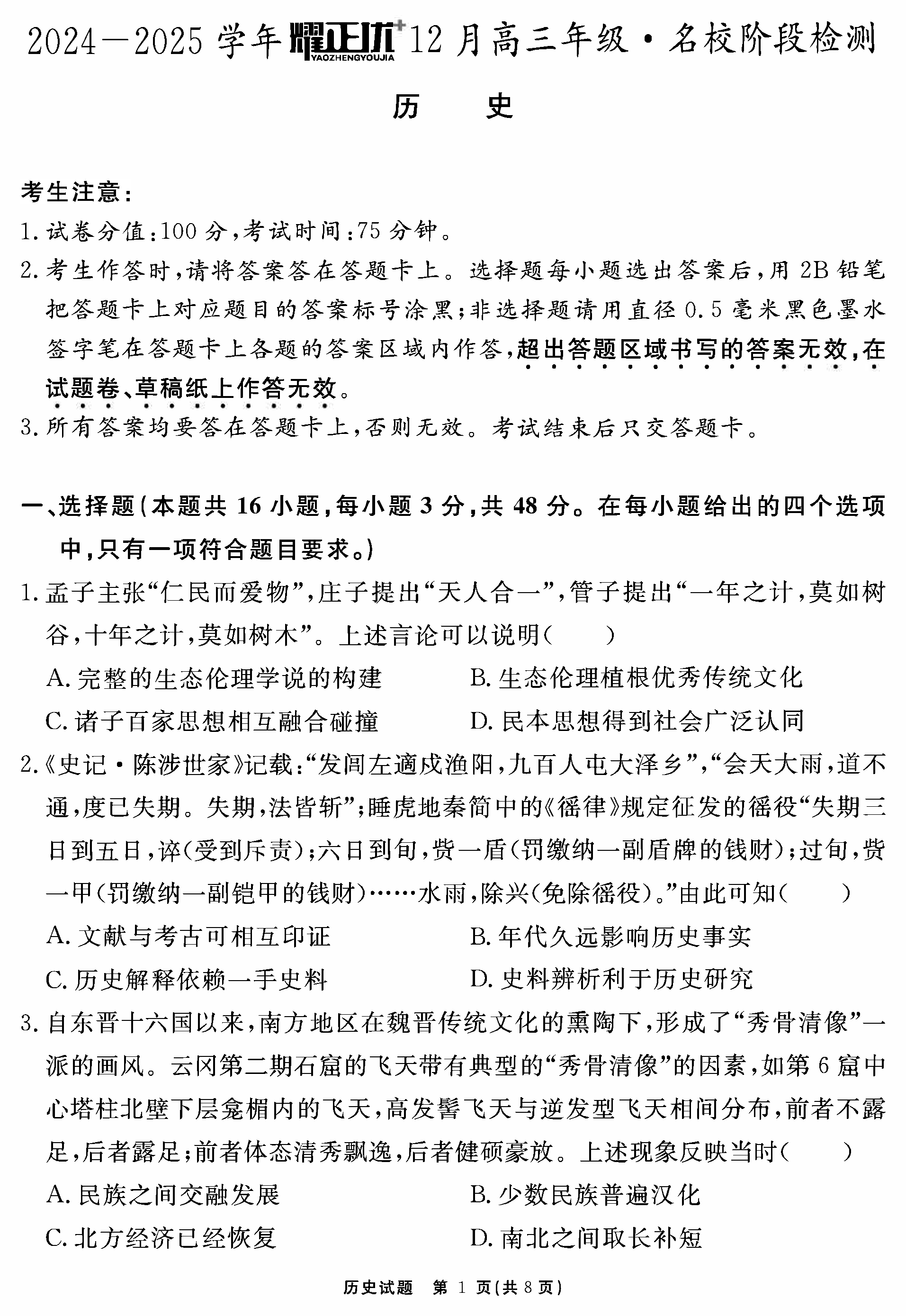 安徽2024-2025学年耀正优12月高三名校阶段检测历史试题及答案