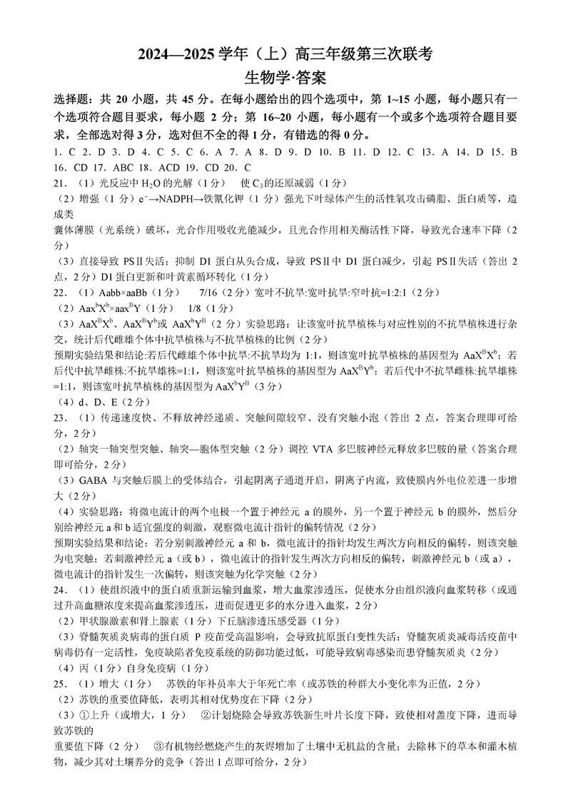 山东齐鲁名校联盟天一大联考2024年12月高三第三次联考生物考试已于近日开考,为方便考生考后及时查看考试情况,查漏补缺、弥补不足,本文整理了试题答案解析相关信息!