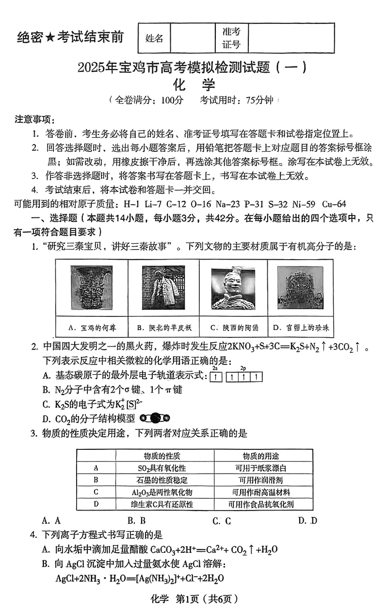 陕西宝鸡2025届高三上学期一模化学试题及答案 时间:2024-12-24 陕西 理综试题 陕西宝鸡2025届高三上学期一模化学考试已于近日开考,为方便考生考后及时查看考试情况,查漏补缺、弥补不足,本文整理了试题答案解析相关信息! 汇总:陕西宝鸡2025届高三上学期一模试题及答案汇总 化学试题及答案解析
