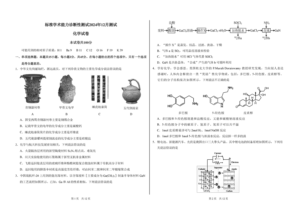 中学生标准学术能力诊断性测试2024-2025学年高三上12月测试化学试题及答案