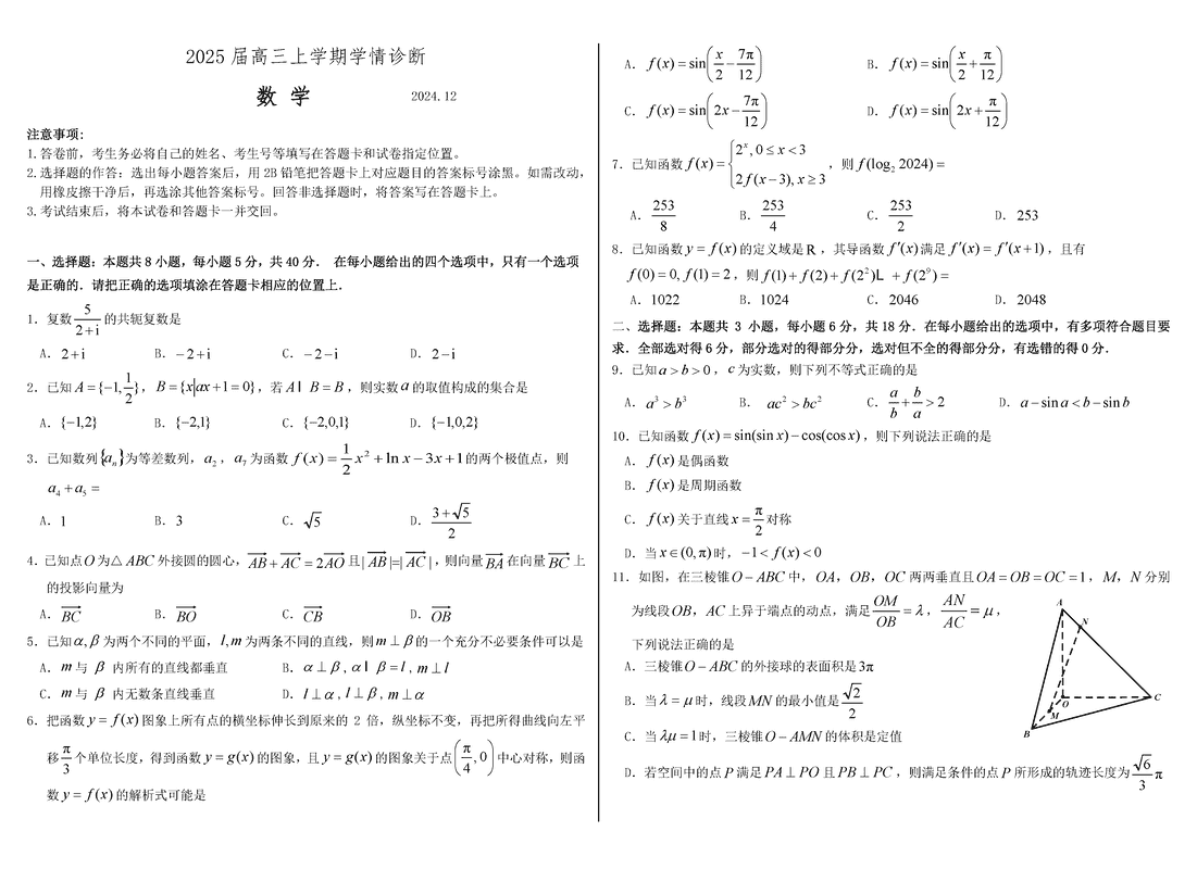山东中学联盟百校大联考2025届高三上12月学情诊断数学试题及答案