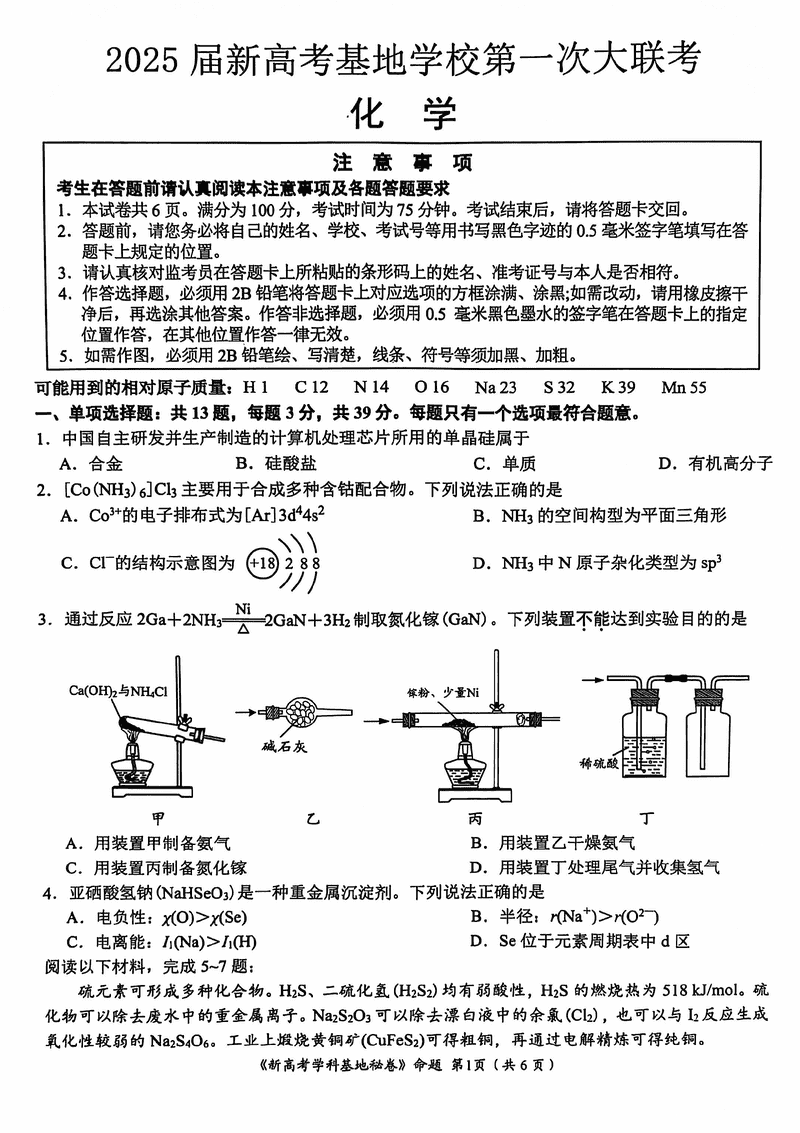 江苏新高考基地学校2025届高三12月第一次大联考化学试题及答案