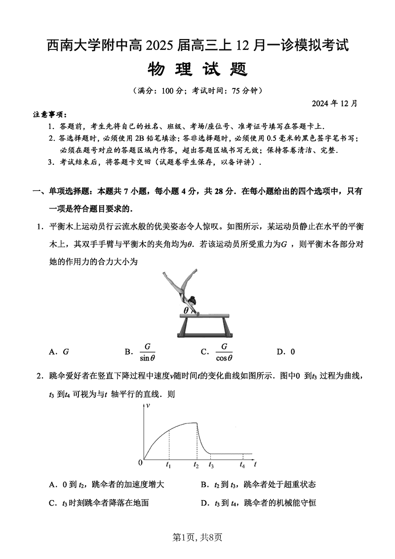 重庆西南大学附中2025届高三12月一诊模拟物理试题及答案