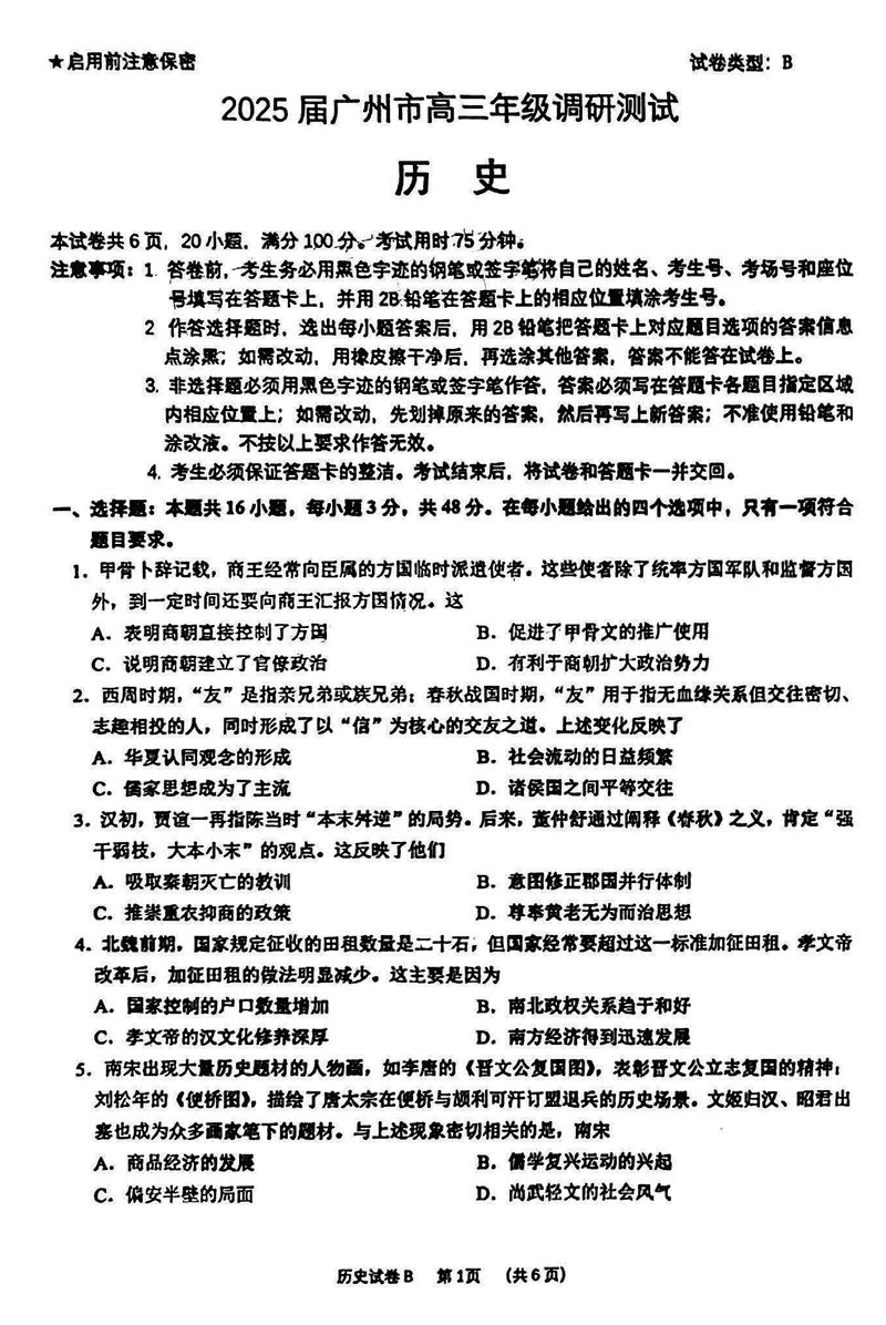 2025届广州零模高三12月调研测试历史试题及答案 时间:2024-12-26 广东 文综试题 2025届广州零模高三12月调研测试历史考试已于近日开考,为方便考生考后及时查看考试情况,查漏补缺、弥补不足,本文整理了试题答案解析相关信息! 汇总:2025届广州零模高三12月调研测试试题及答案汇总 历史试题及答案解析