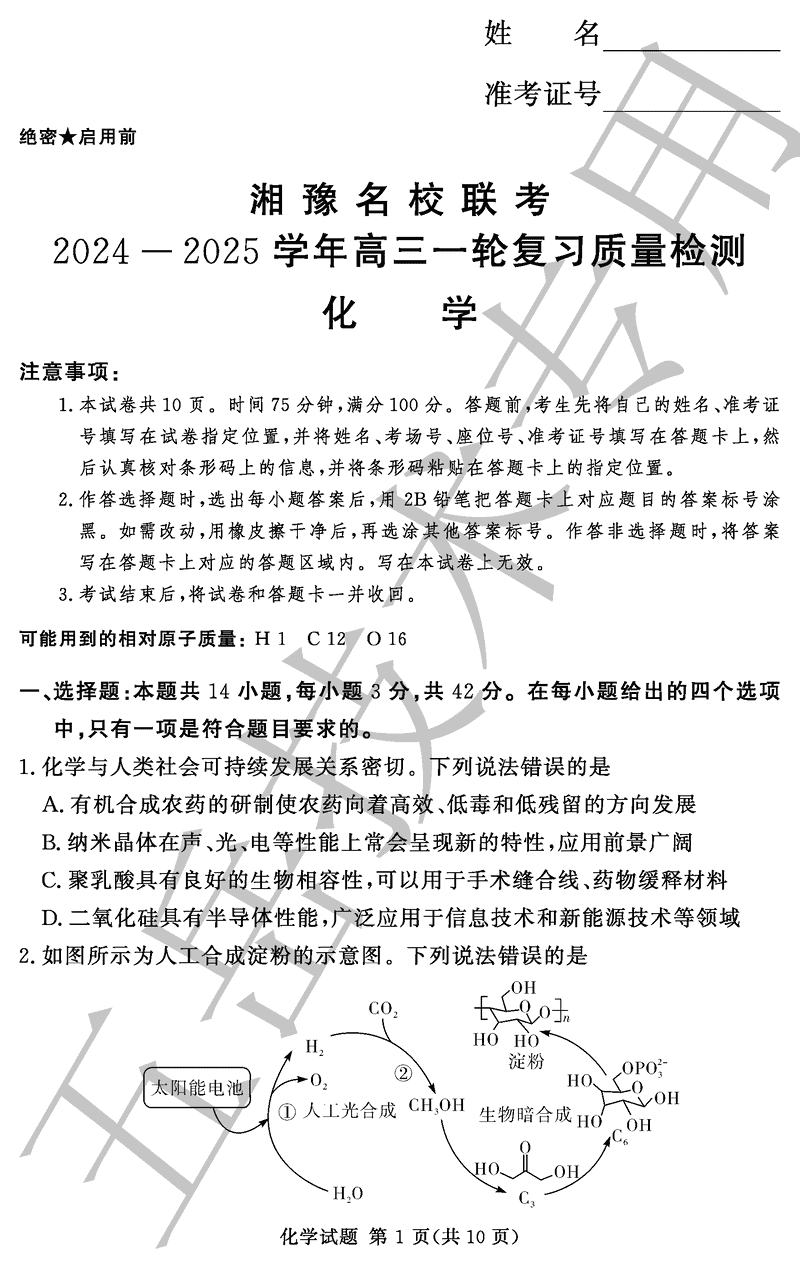 湘豫名校联考2024-2025学年高三上一轮复习质检化学试题及答案
