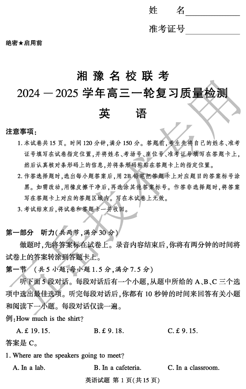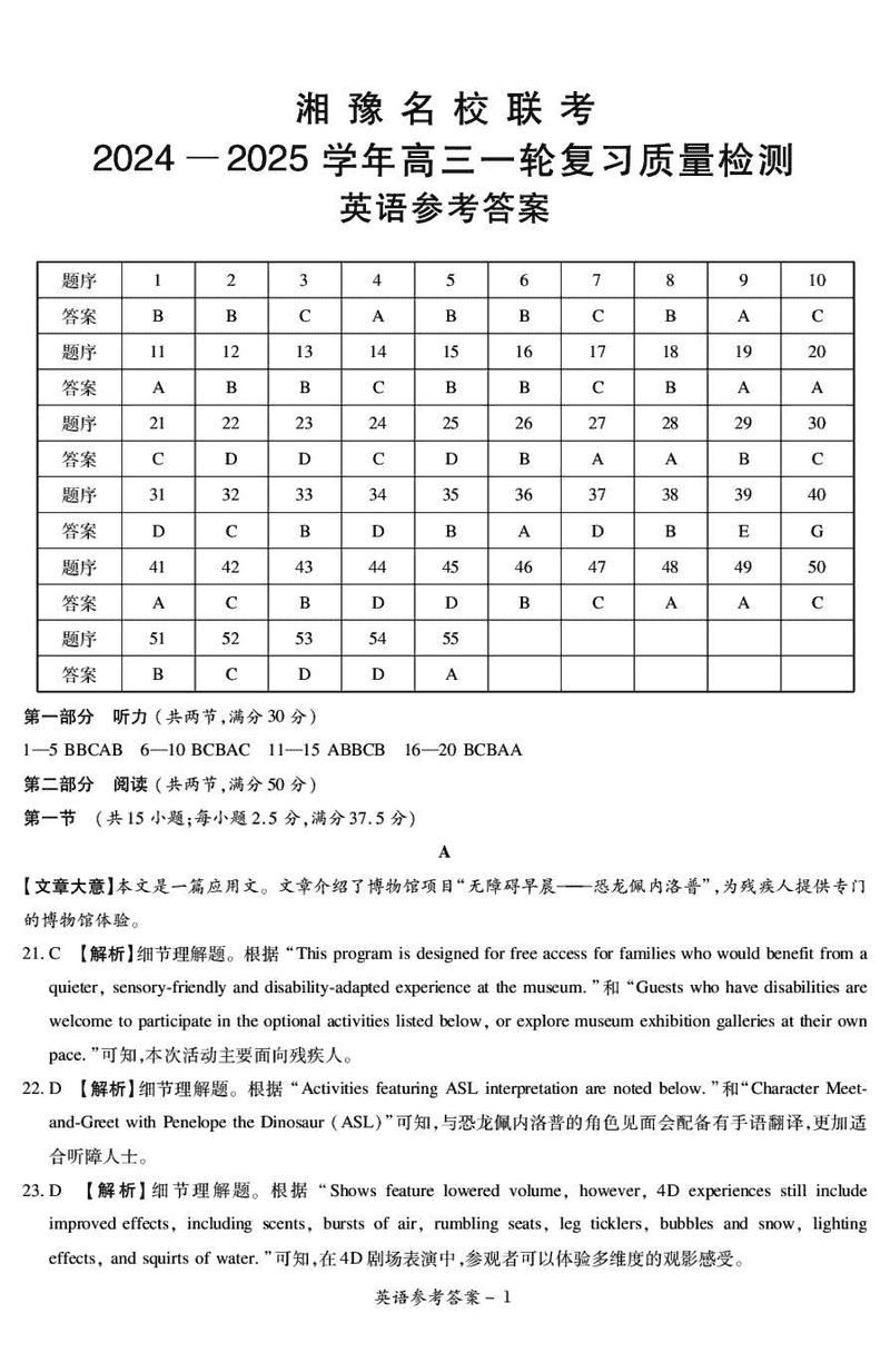 湘豫名校联考2024-2025学年高三上一轮复习质检英语考试已于近日开考,为方便考生考后及时查看考试情况,查漏补缺、弥补不足,本文整理了试题答案解析相关信息!