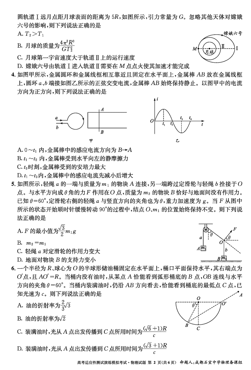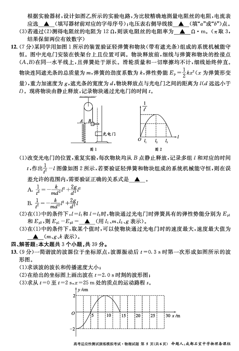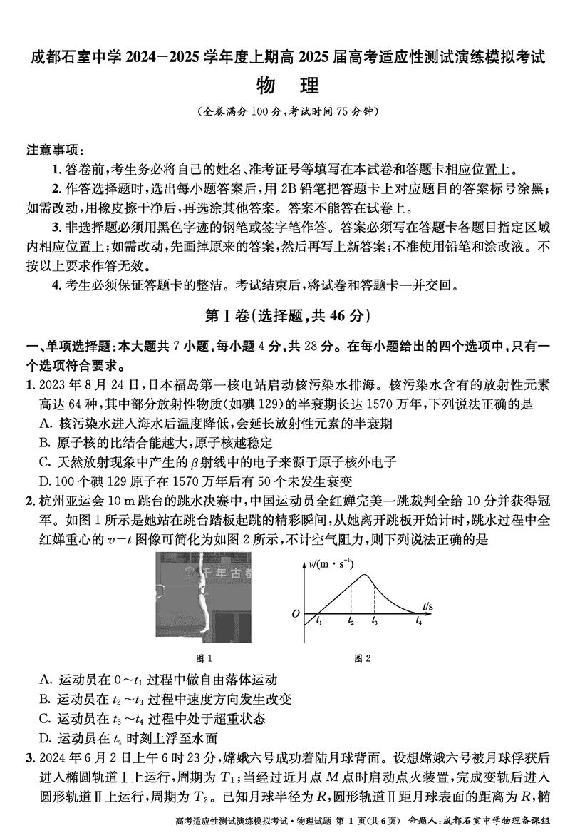 成都石室中学2025年高考适应性测试演练八省联考模拟物理考试已于近日开考,为方便考生考后及时查看考试情况,查漏补缺、弥补不足,本文整理了试题答案解析相关信息!