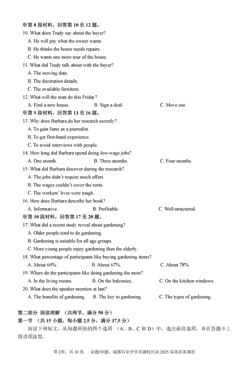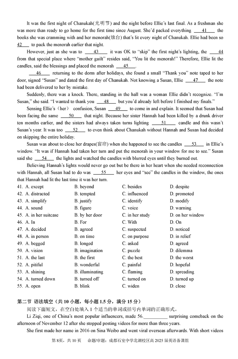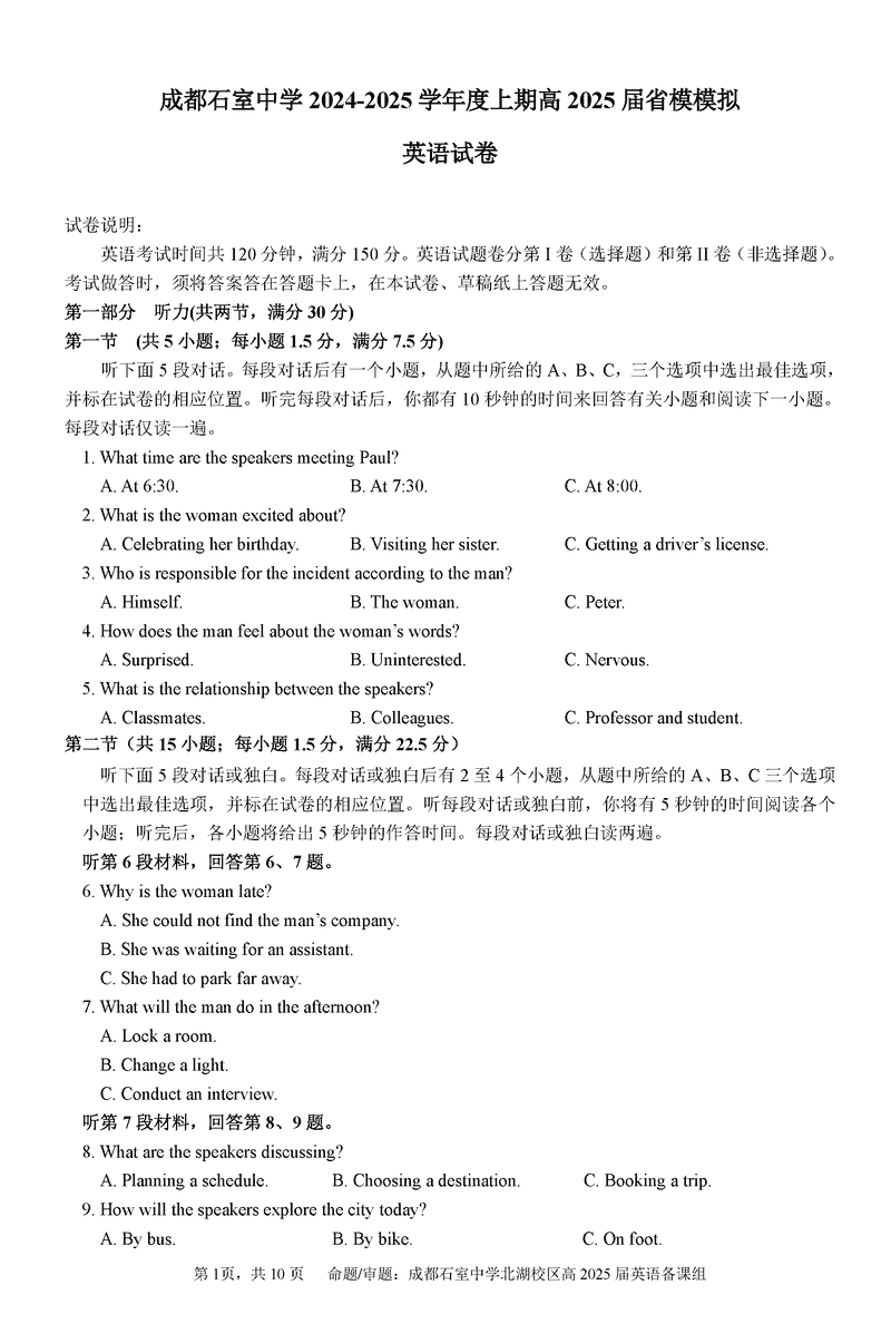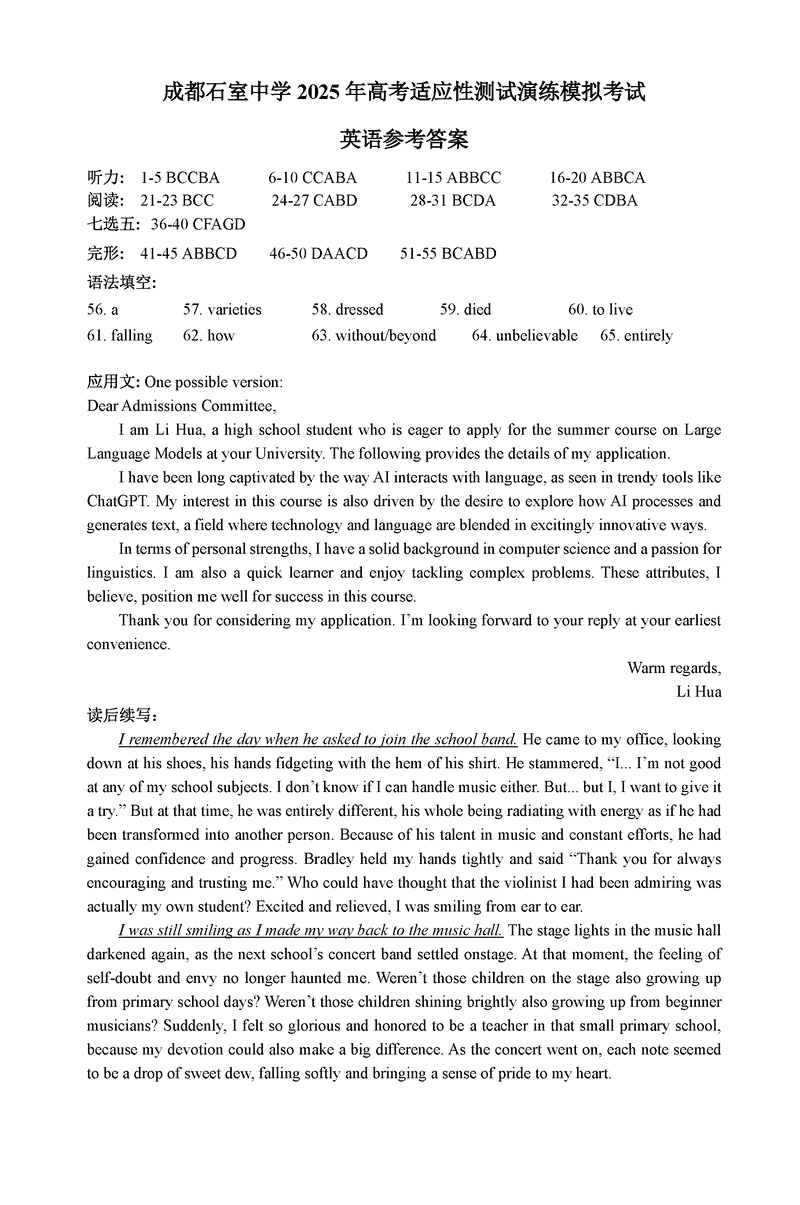成都石室中学2025年高考适应性测试演练八省联考模拟英语考试已于近日开考,为方便考生考后及时查看考试情况,查漏补缺、弥补不足,本文整理了试题答案解析相关信息!