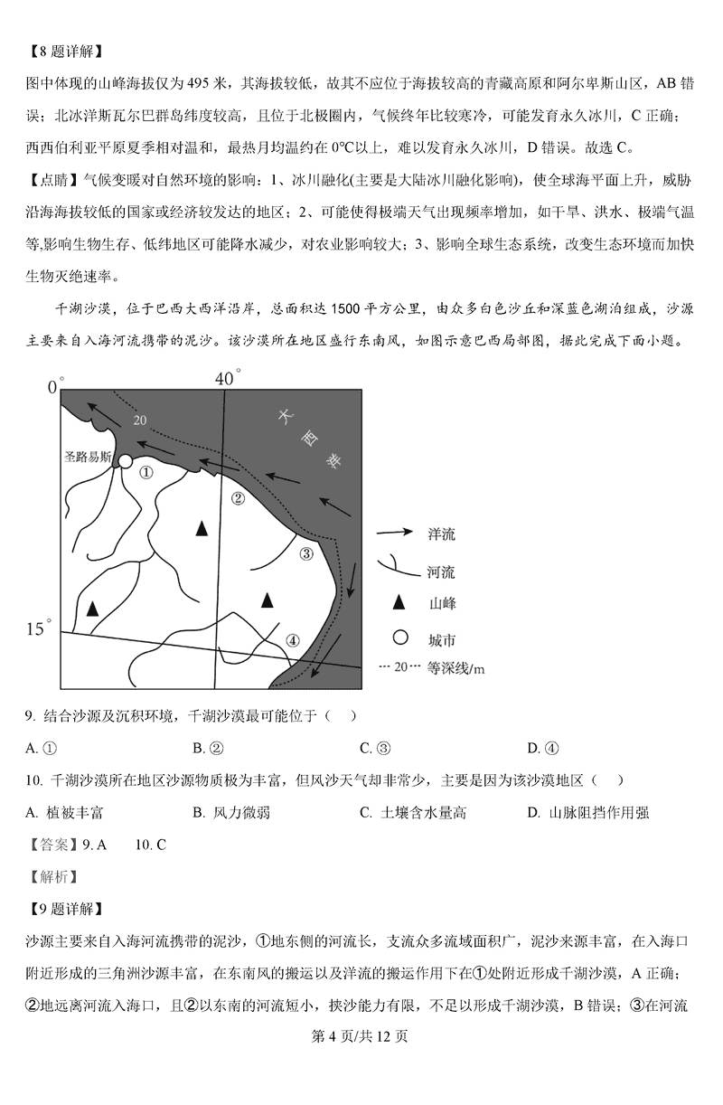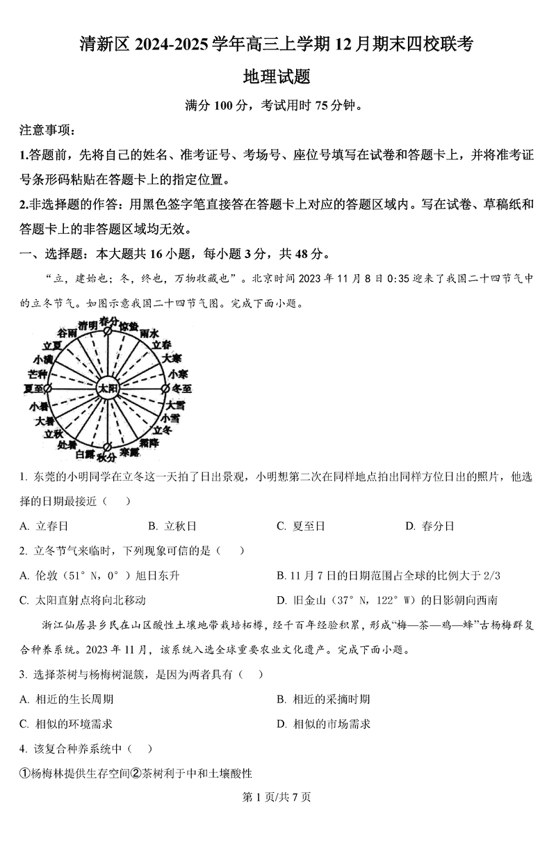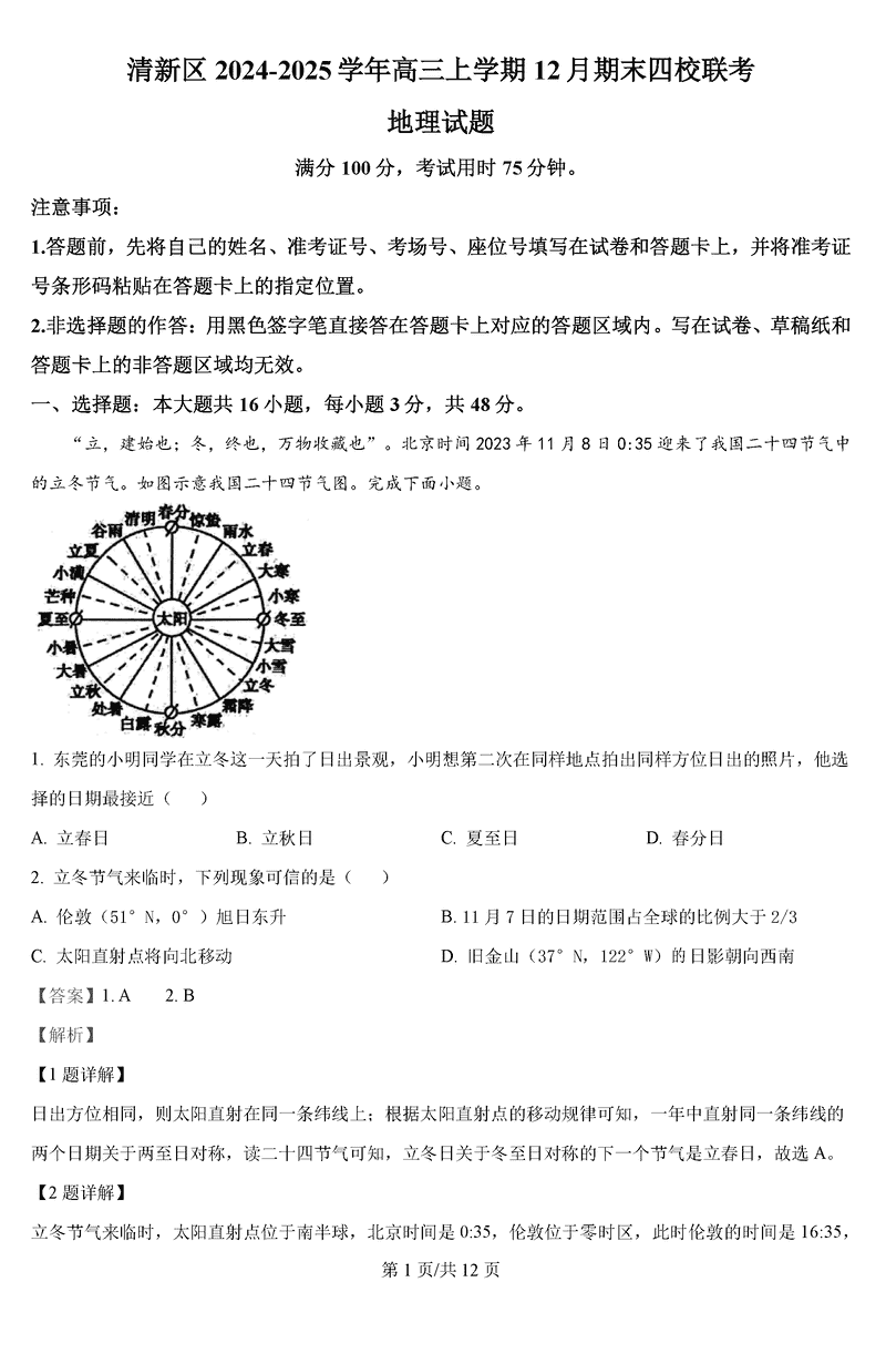 清远市清新区四校联考22025届高三上12月期末地理试题及答案