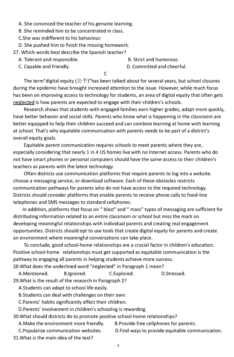 湖南浏阳市联盟校2024年高三上学期12月联考英语试题及答案