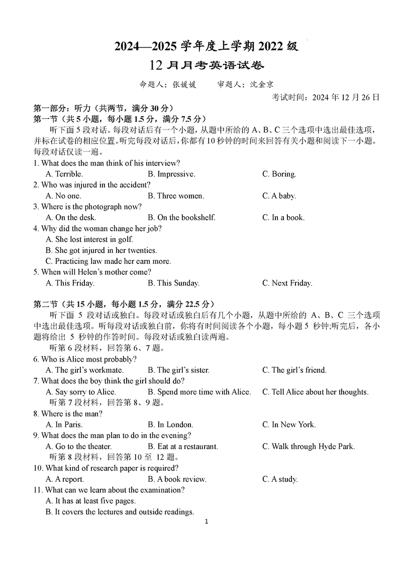 湖北沙市中学2024-2025学年高三上12月月考英语考试已于近日开考,为方便考生考后及时查看考试情况,查漏补缺、弥补不足,本文整理了试题答案解析相关信息!