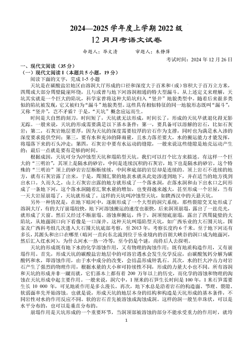 湖北沙市中学2024-2025学年高三上12月月考语文试题及答案