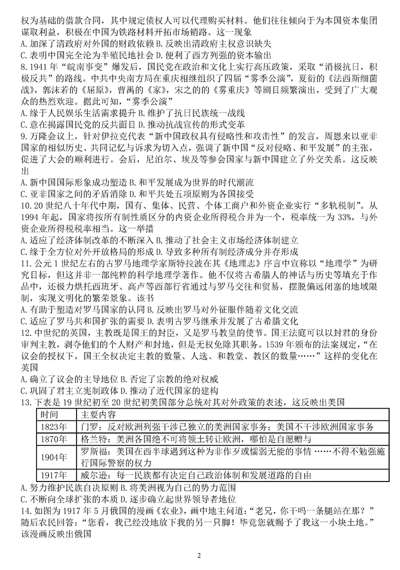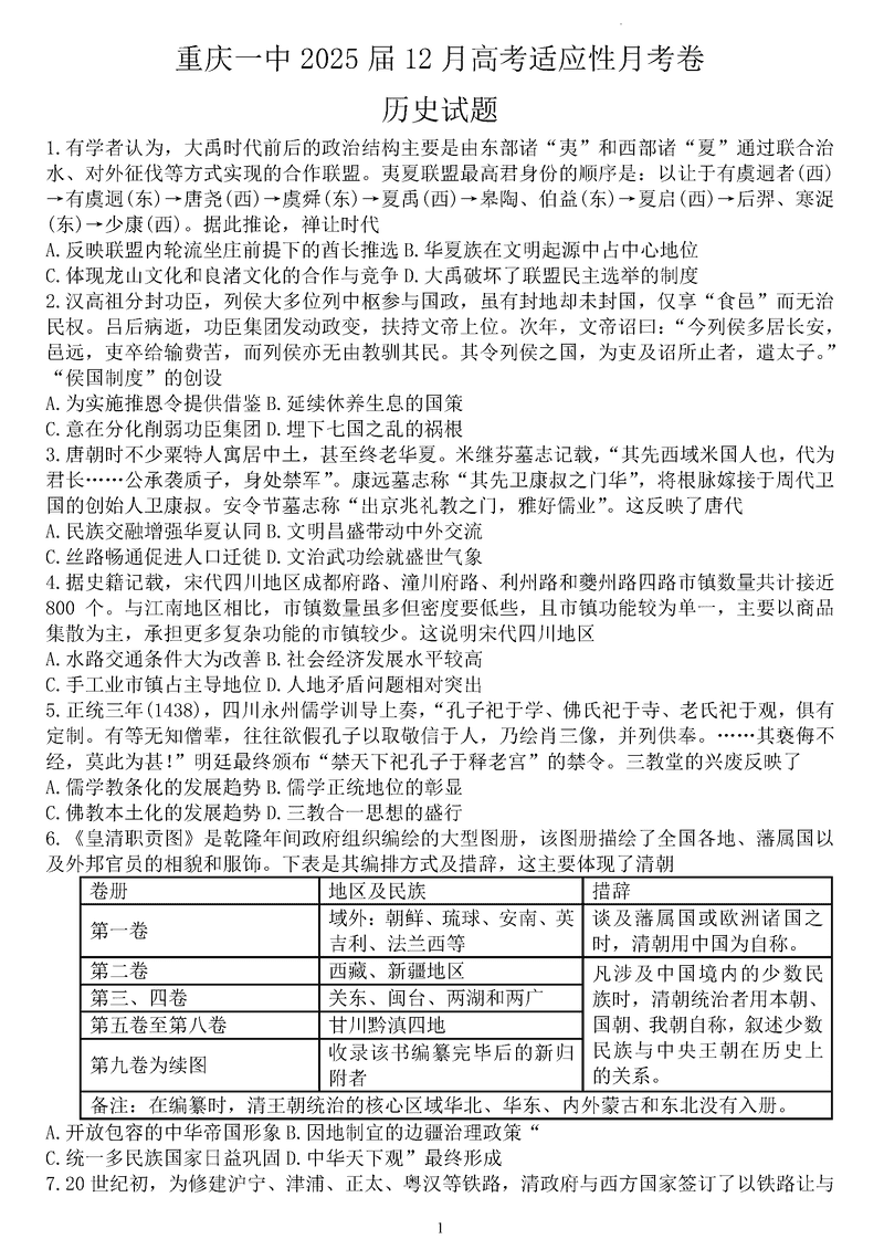 重庆一中2025届高三上学期12月月考历史试题及答案