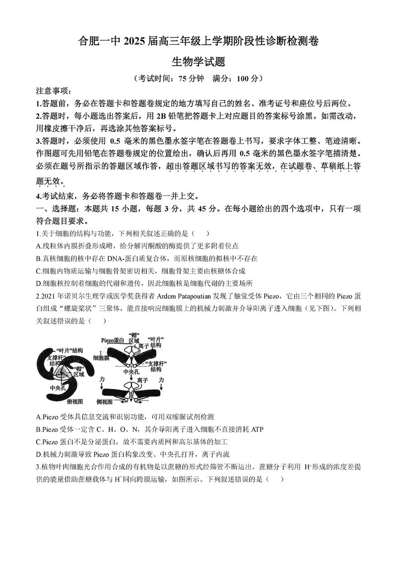 安徽省十联考合肥一中2025届高三上学期阶段性诊断检测生物试题及答案