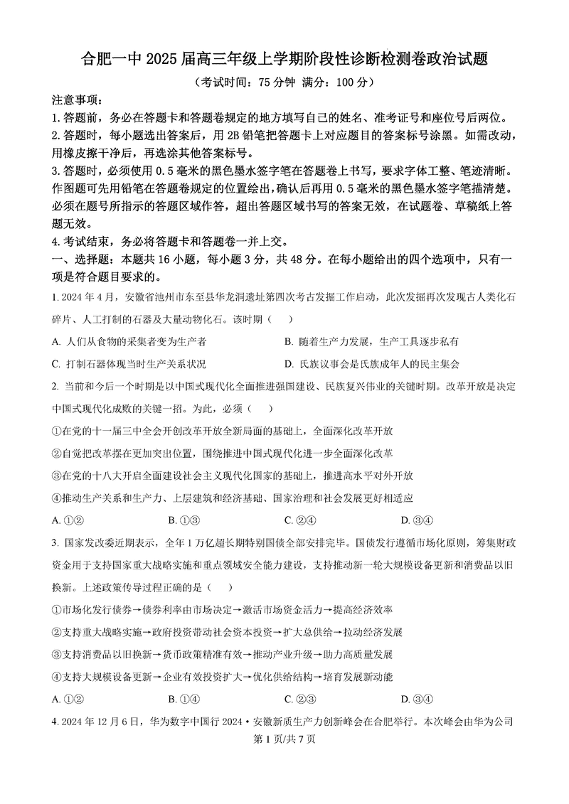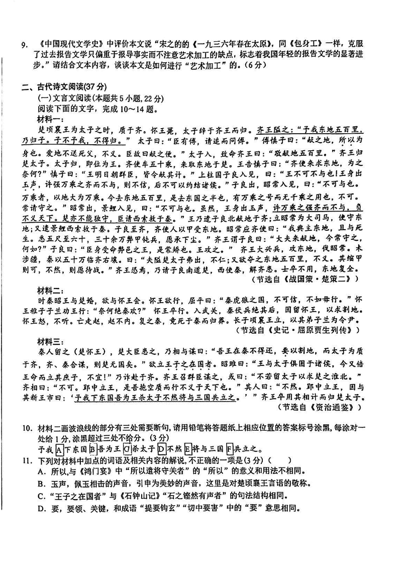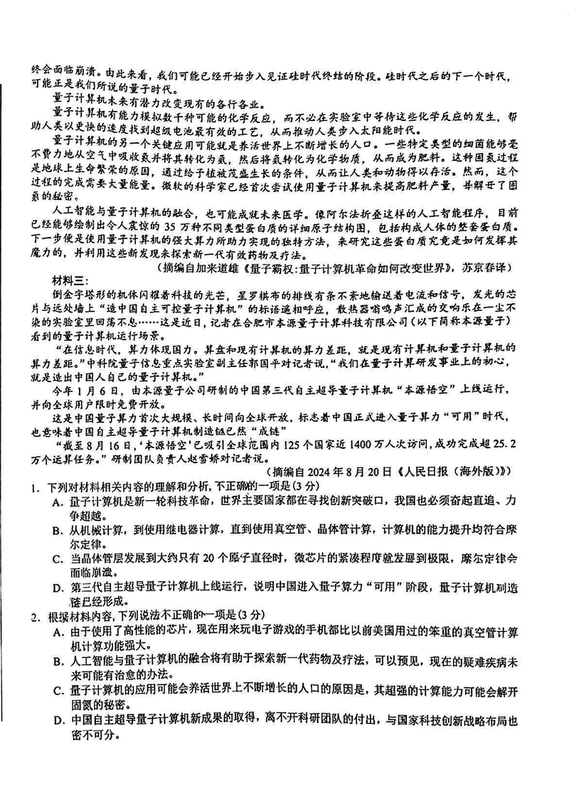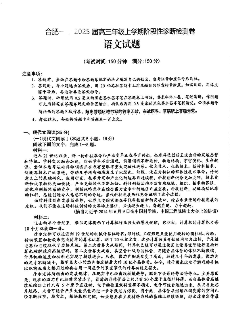 安徽省十联考合肥一中2025届高三上学期阶段性诊断检测语文试题及答案