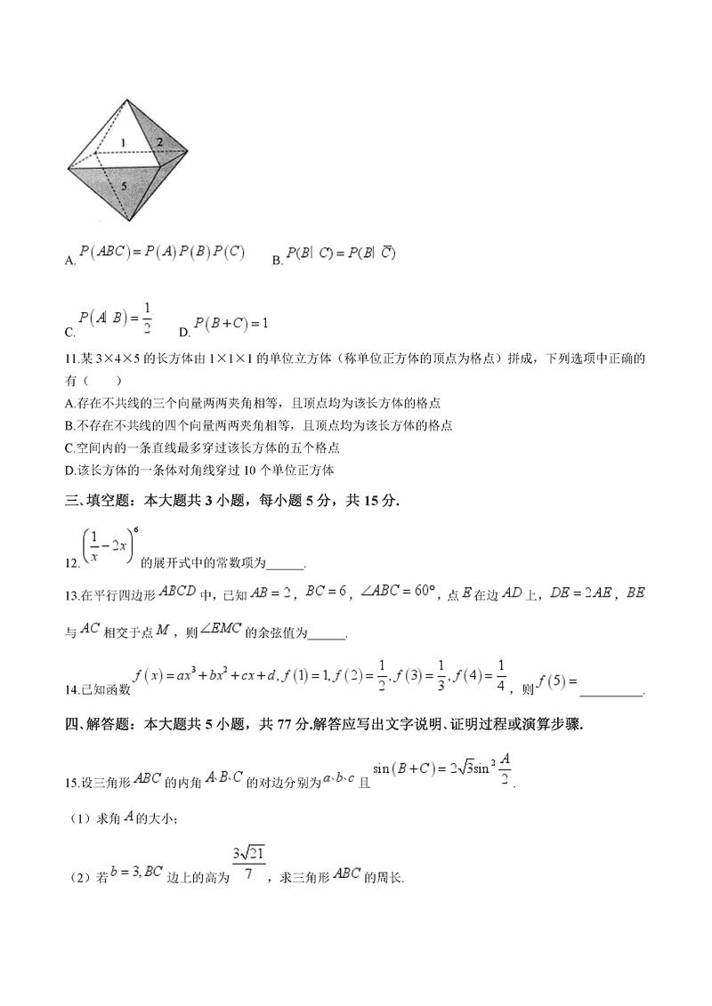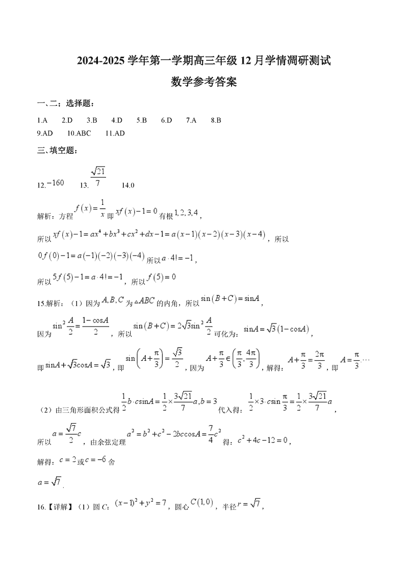 扬州市高邮市2024-2025学年高三上学期12月月考数学试题及答案