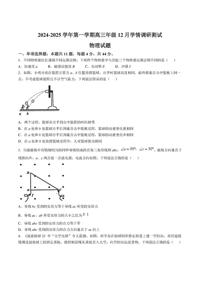 扬州市高邮市2024-2025学年高三上学期12月月考物理试题及答案