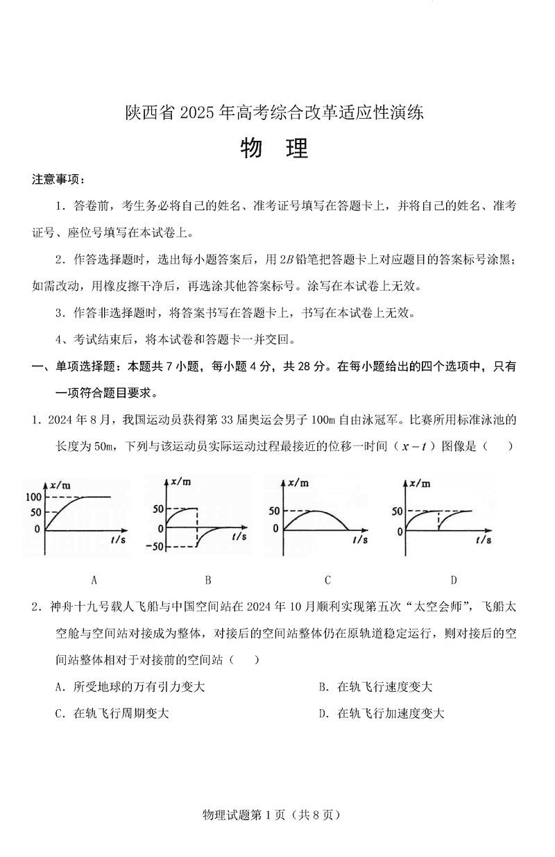 陕西八省联考2025年高考综合改革适应性演练物理试题及答案